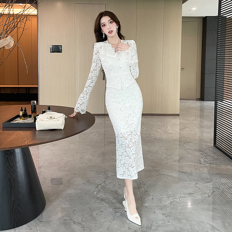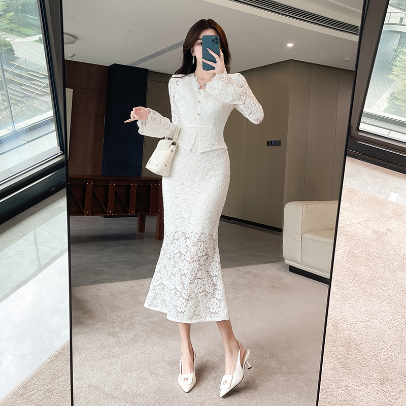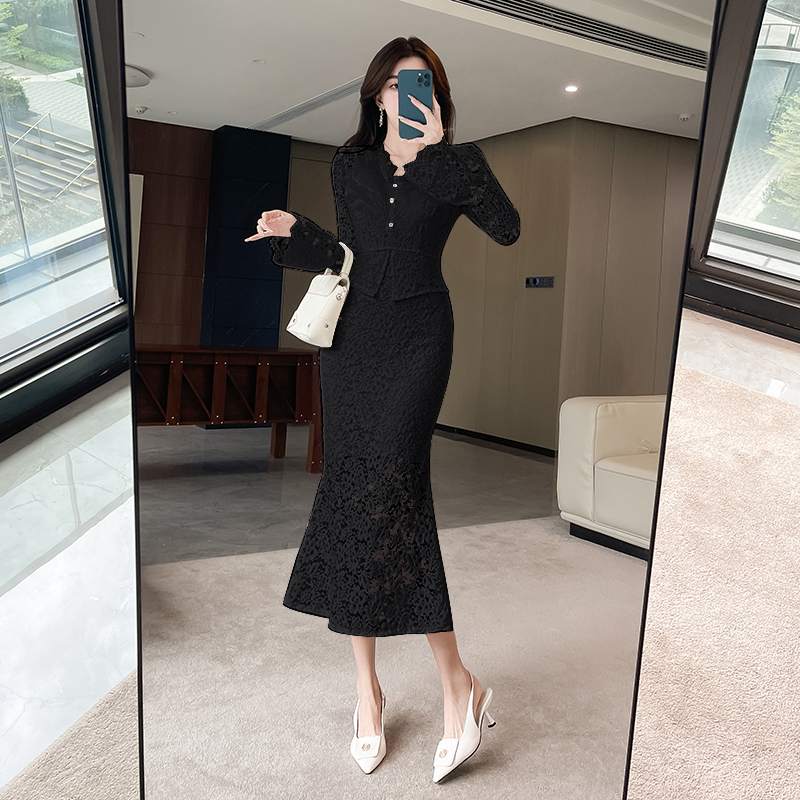FA42919# 视频秋冬季新款蕾丝v领长裙荷叶边包臀连衣裙 服裝批發女裝批發服飾貨源