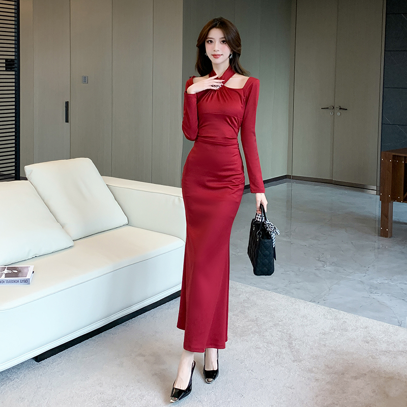 FA42920# 视频秋冬季新款长裙挂脖紧身包臀连衣裙 服裝批發女裝批發服飾貨源