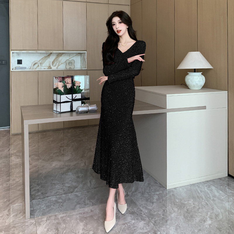 视频秋冬新款女V领长袖高级亮片修身包臀鱼尾连衣裙礼服 服裝批發女裝批發服飾貨源