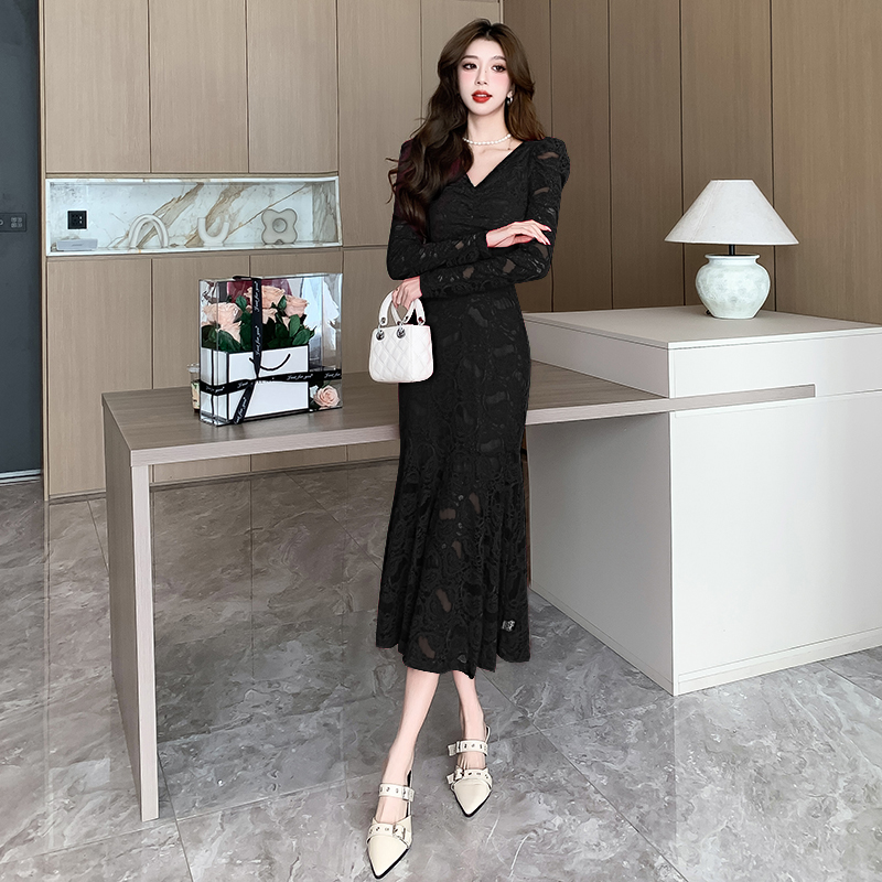 FA42924# 视频秋冬新款蕾丝V领长袖收腰显瘦包臀鱼尾连衣长裙 服裝批發女裝批發服飾貨源