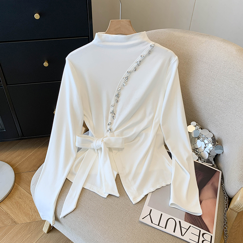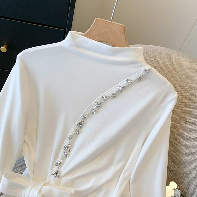 FA43237# 重工钉珠半高领长袖打底衫女秋冬新款开叉气质百搭磨毛不规则上衣 服裝批發女裝批發服飾貨源