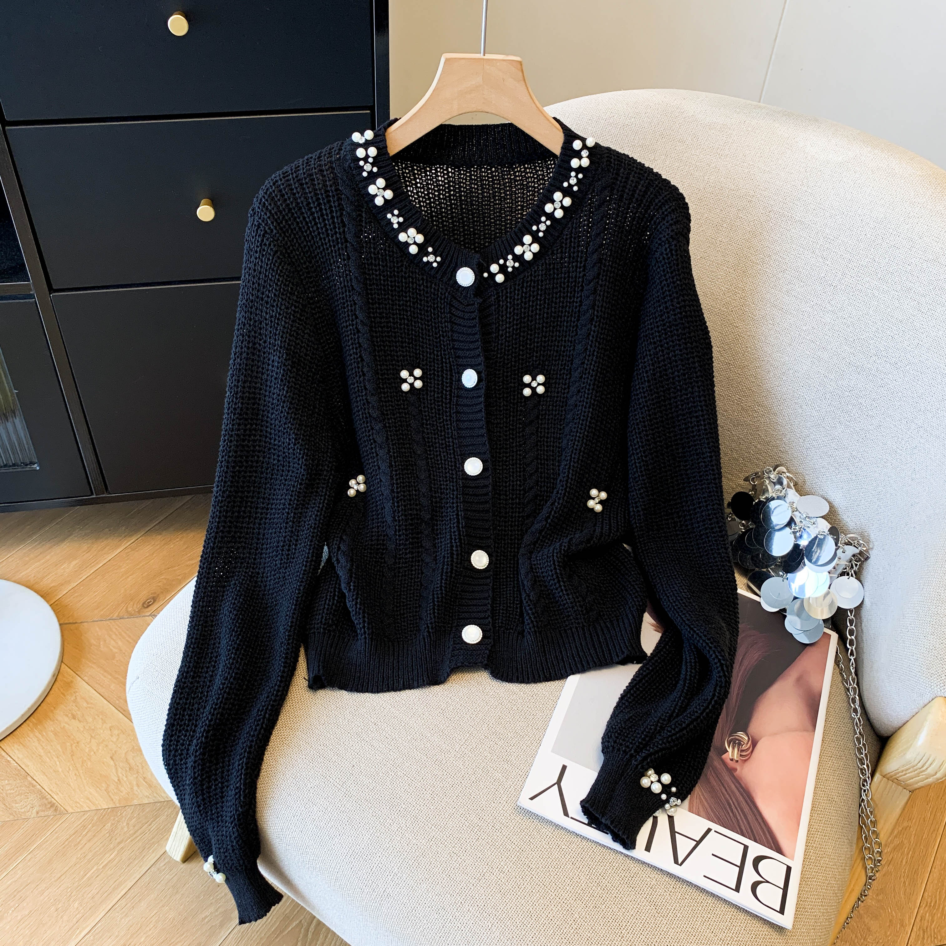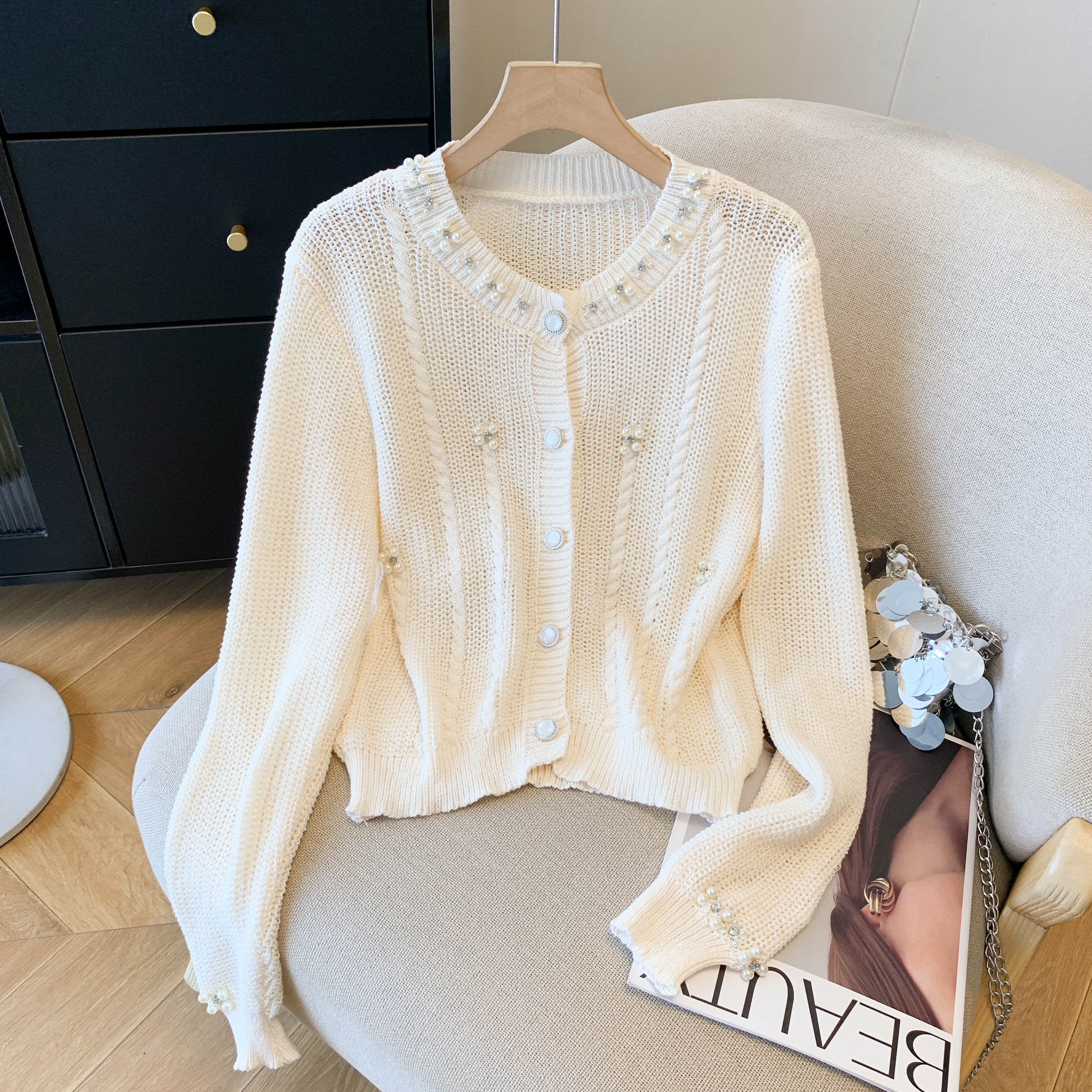 FA43241# 秋冬红色小香风重工钉珠毛衣开衫珍珠领针织外套女设计感小众上衣 服裝批發女裝批發服飾貨源