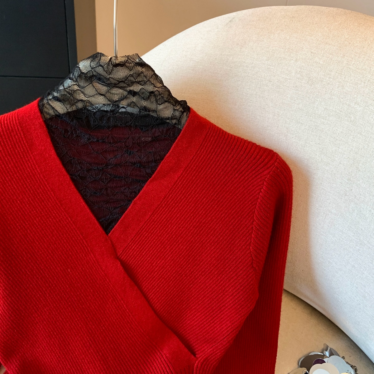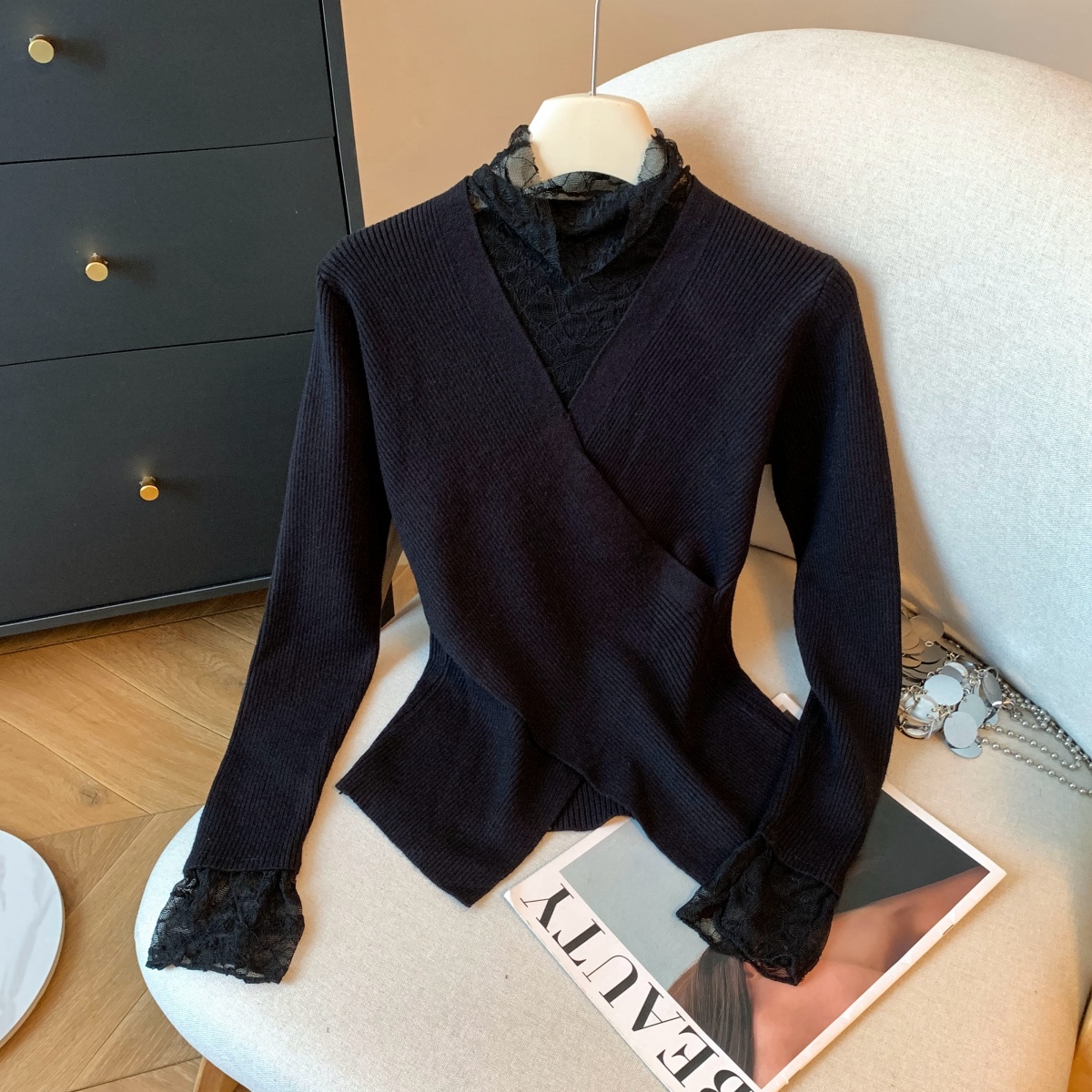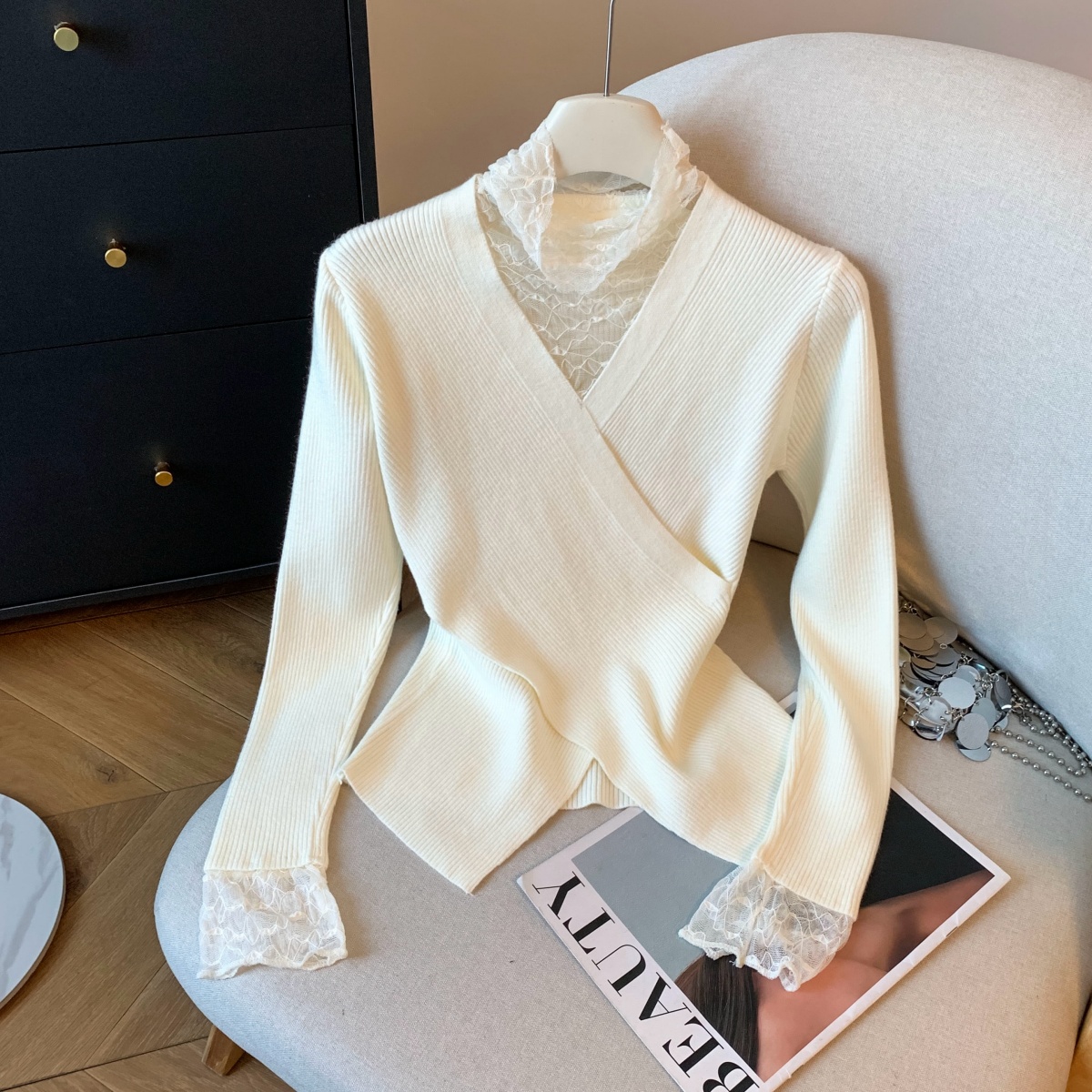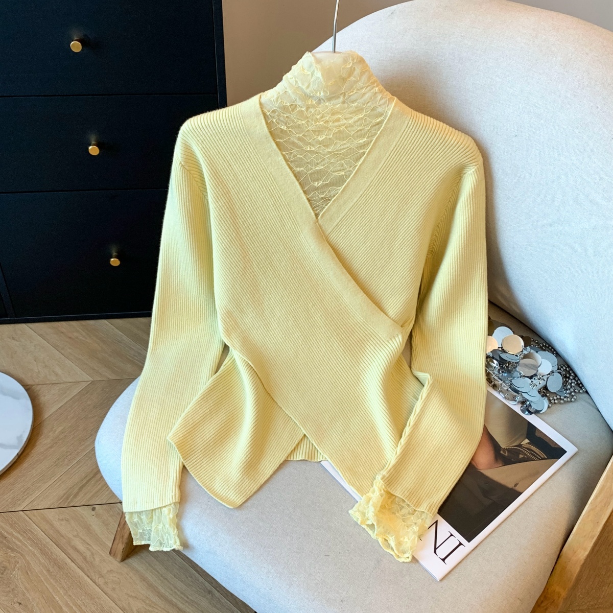 FA43250# 网纱拼接半高领针织衫女秋冬季新款气质长袖打底衫 服裝批發女裝批發服飾貨源