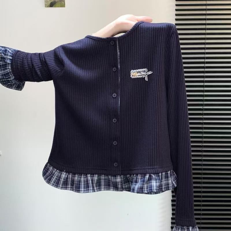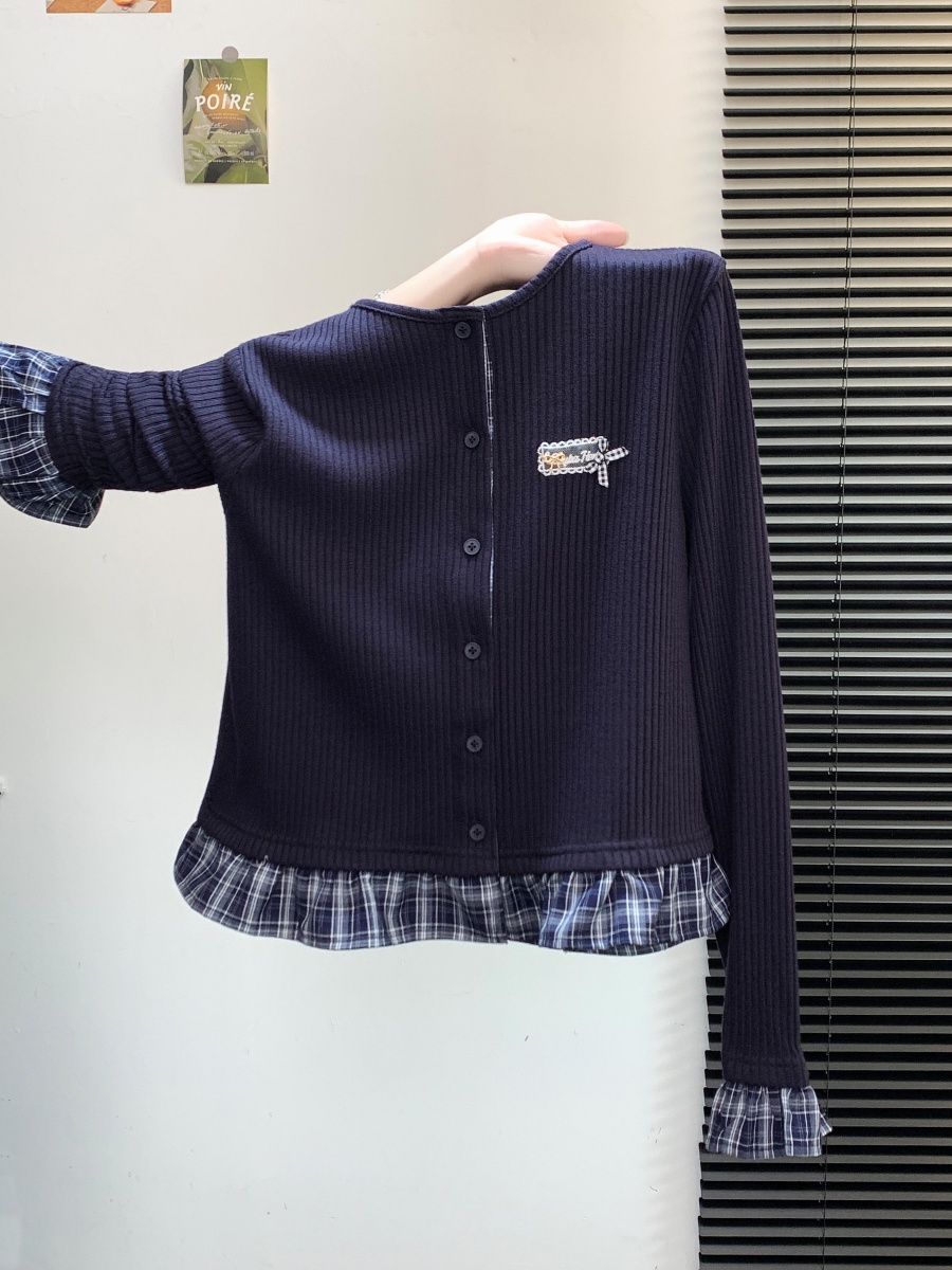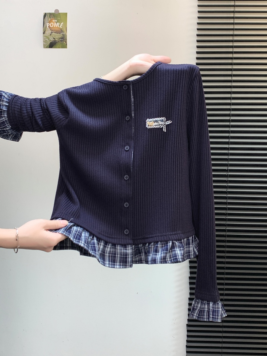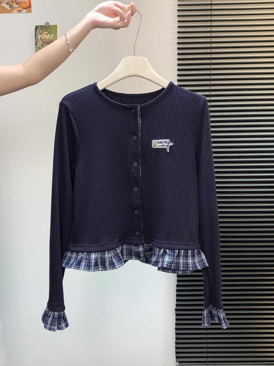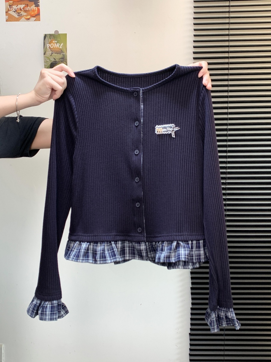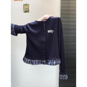 FA43723# 假两件格子花边针织开衫女秋季设计感修身内搭打底短款上衣 服裝批發女裝批發服飾貨源