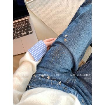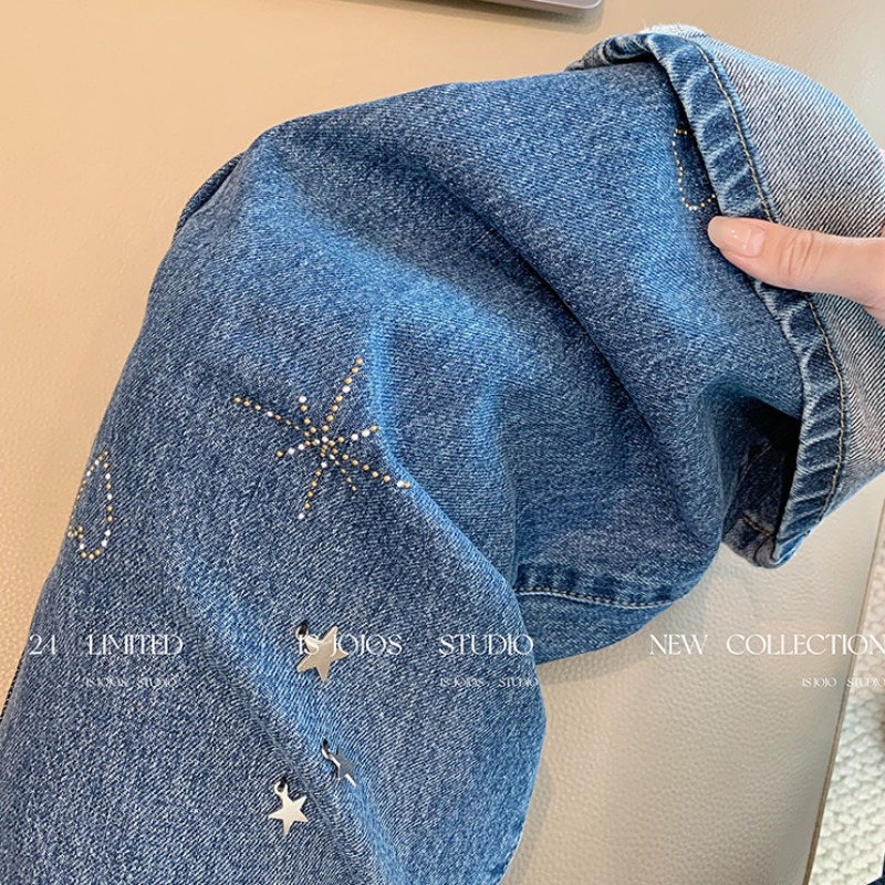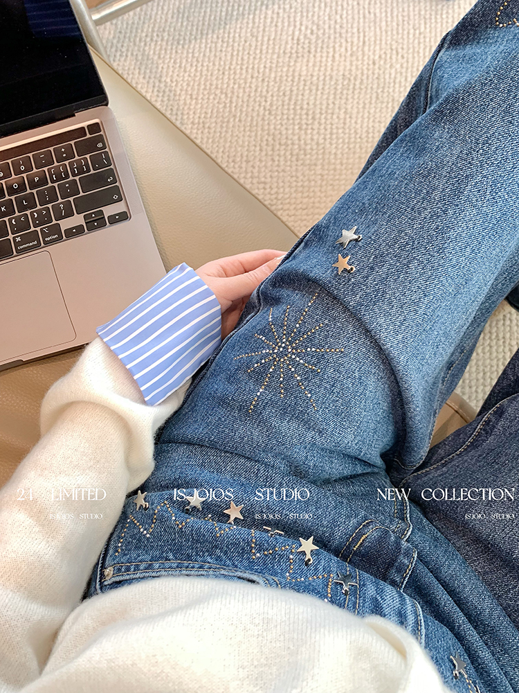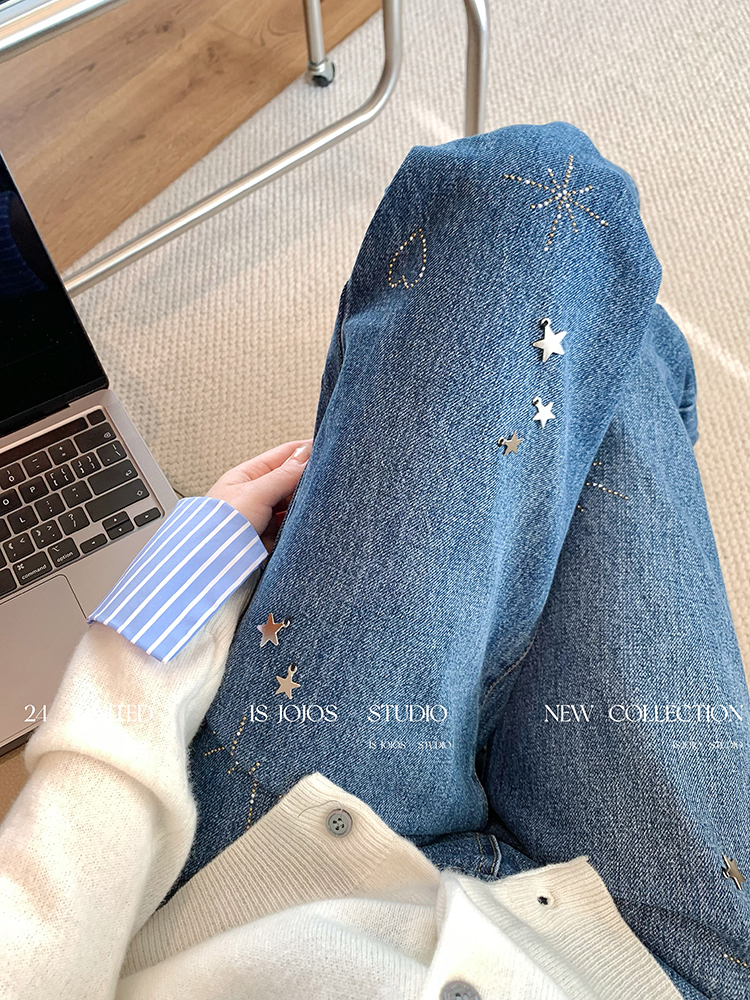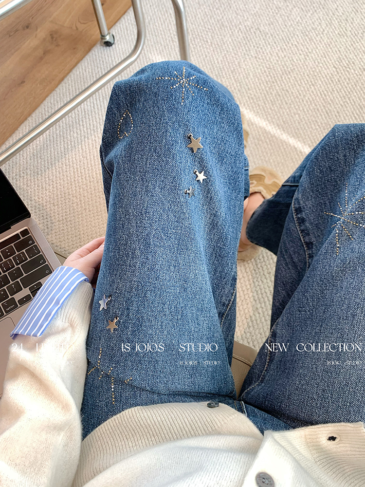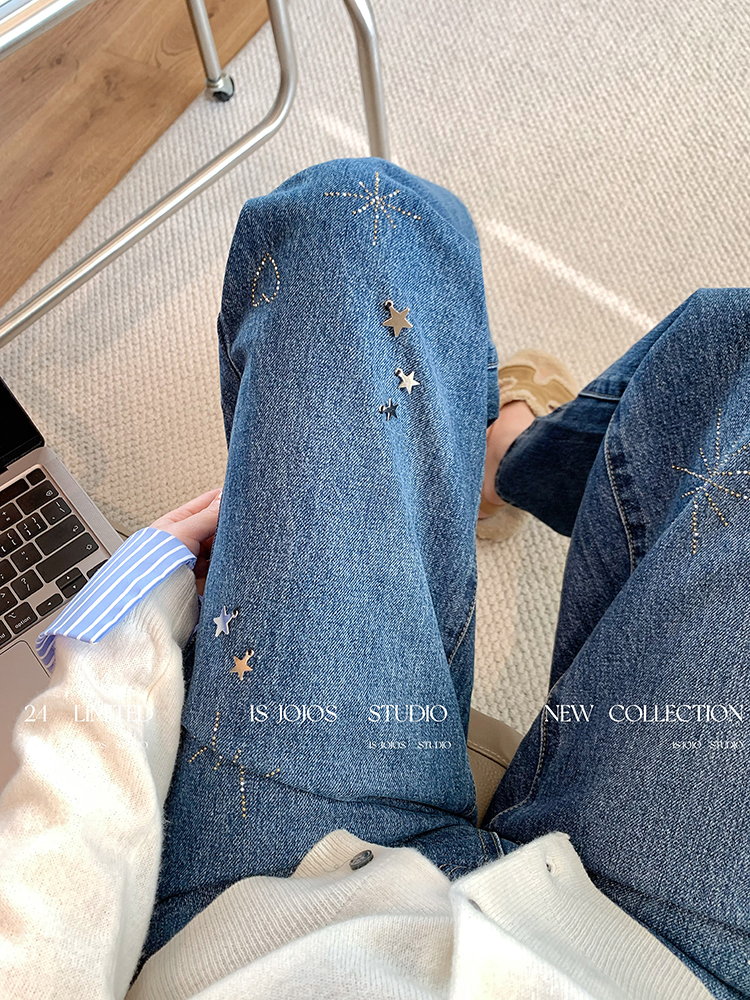 FA43726# 复古小众深蓝色星星烫钻阔腿牛仔裤女新款显瘦宽松高腰直筒裤 服裝批發女裝批發服飾貨源