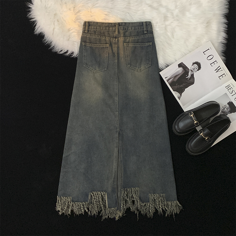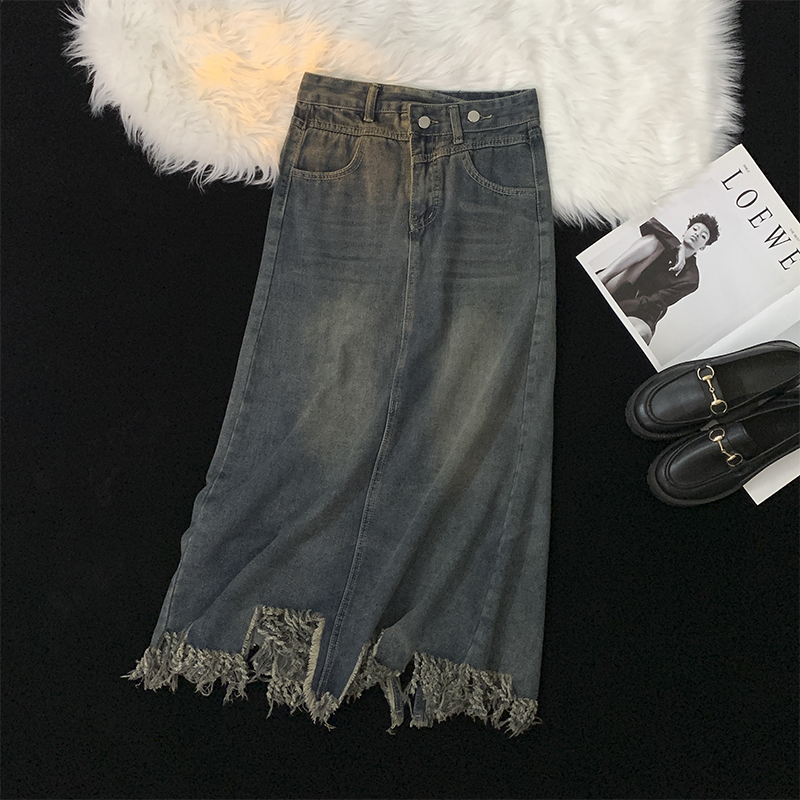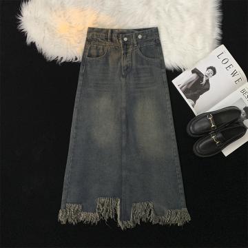 FA43745# 大码女装秋季时髦流苏高腰设计感a字开叉复古牛仔半身长裙 服裝批發女裝批發服飾貨源