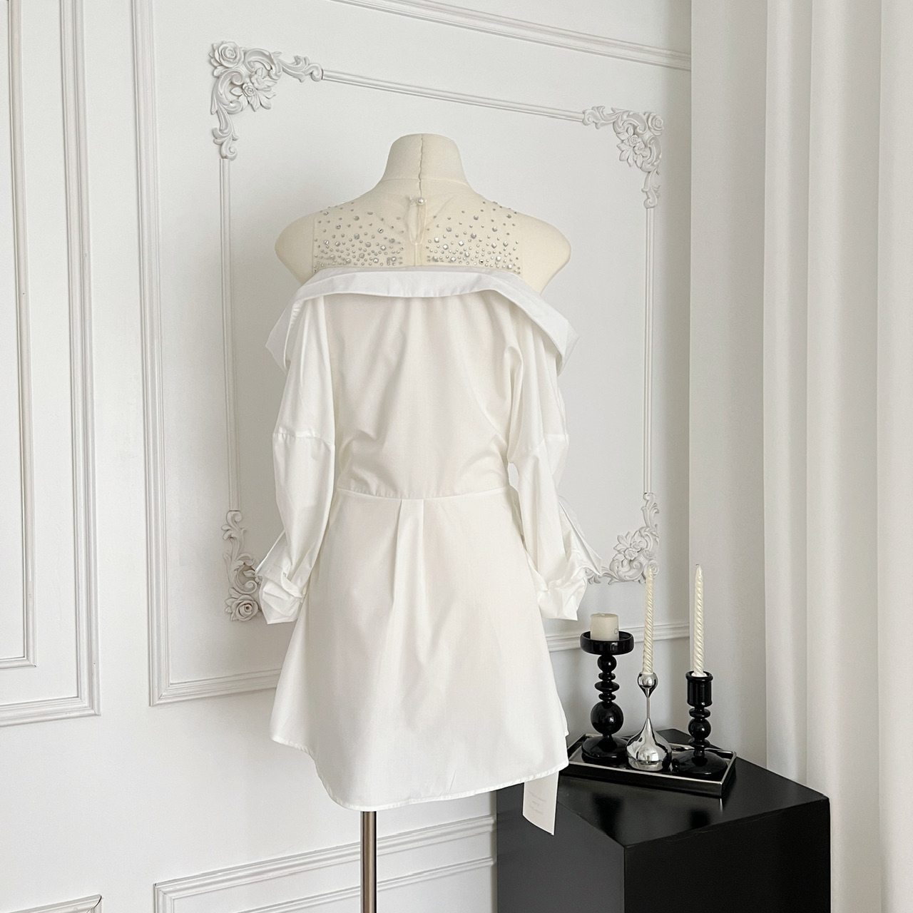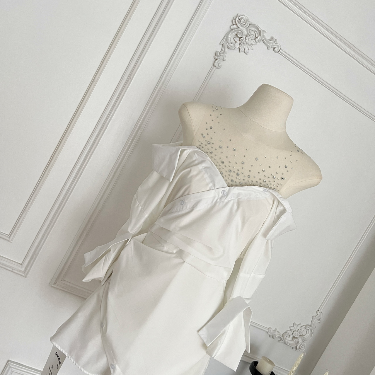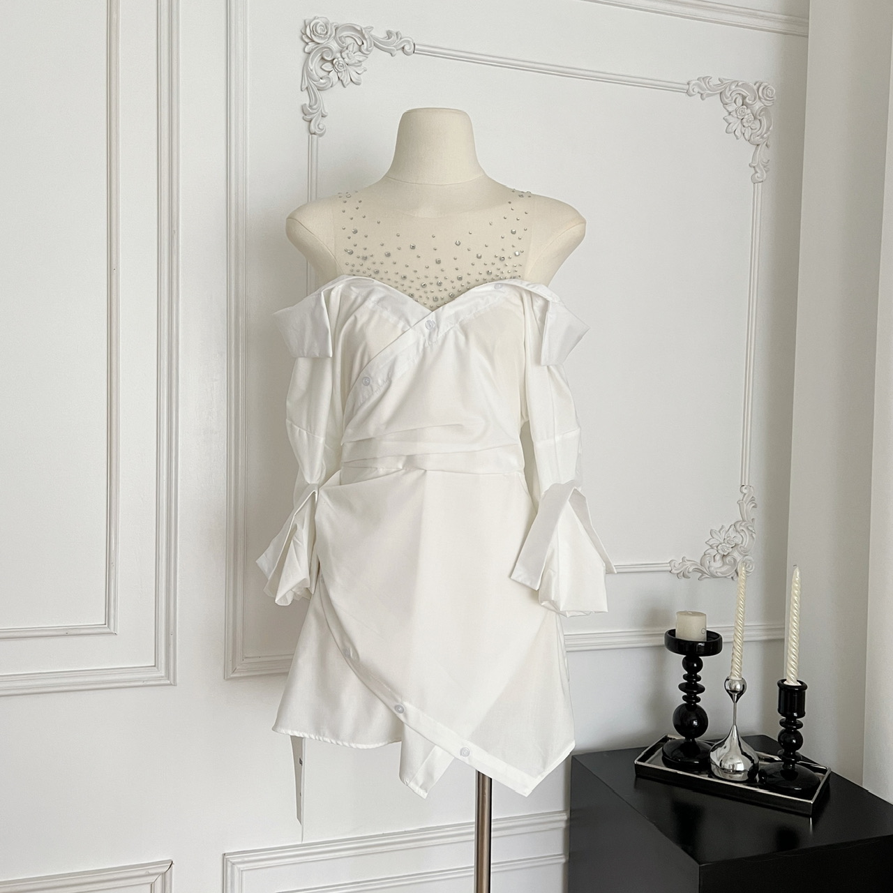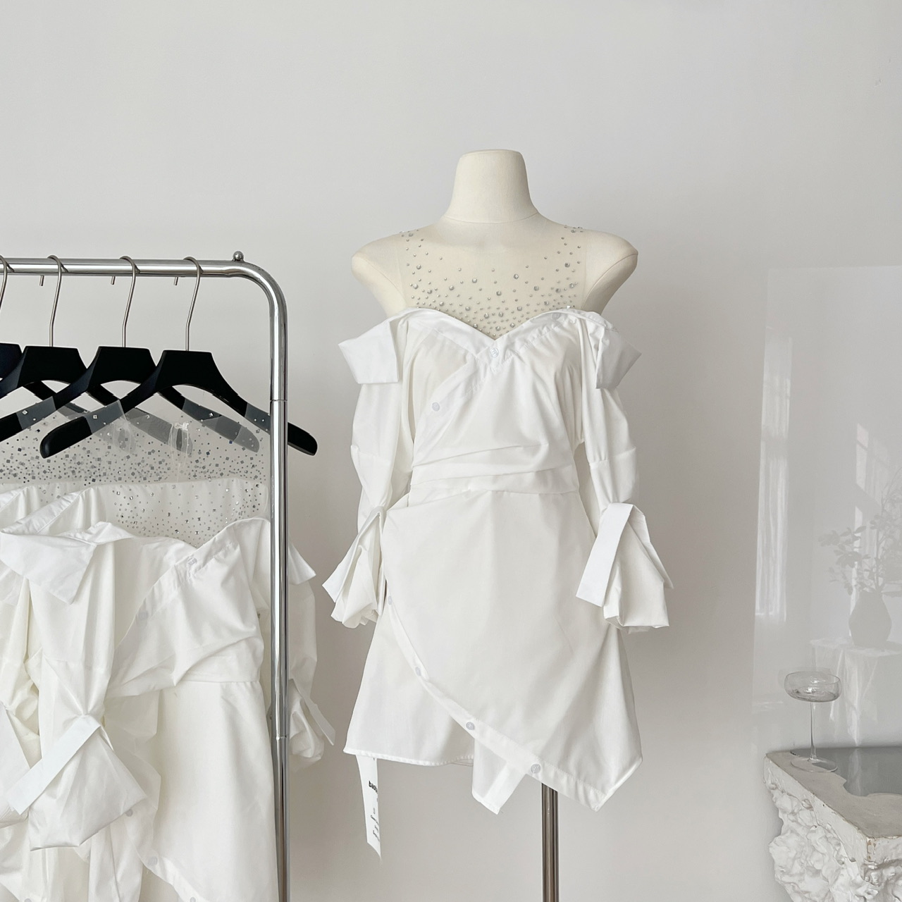 FA43773# 余潇潇时髦海瑟薇设计褶皱假两件拼接烫钻薄纱不规则连衣裙 服裝批發女裝批發服飾貨源