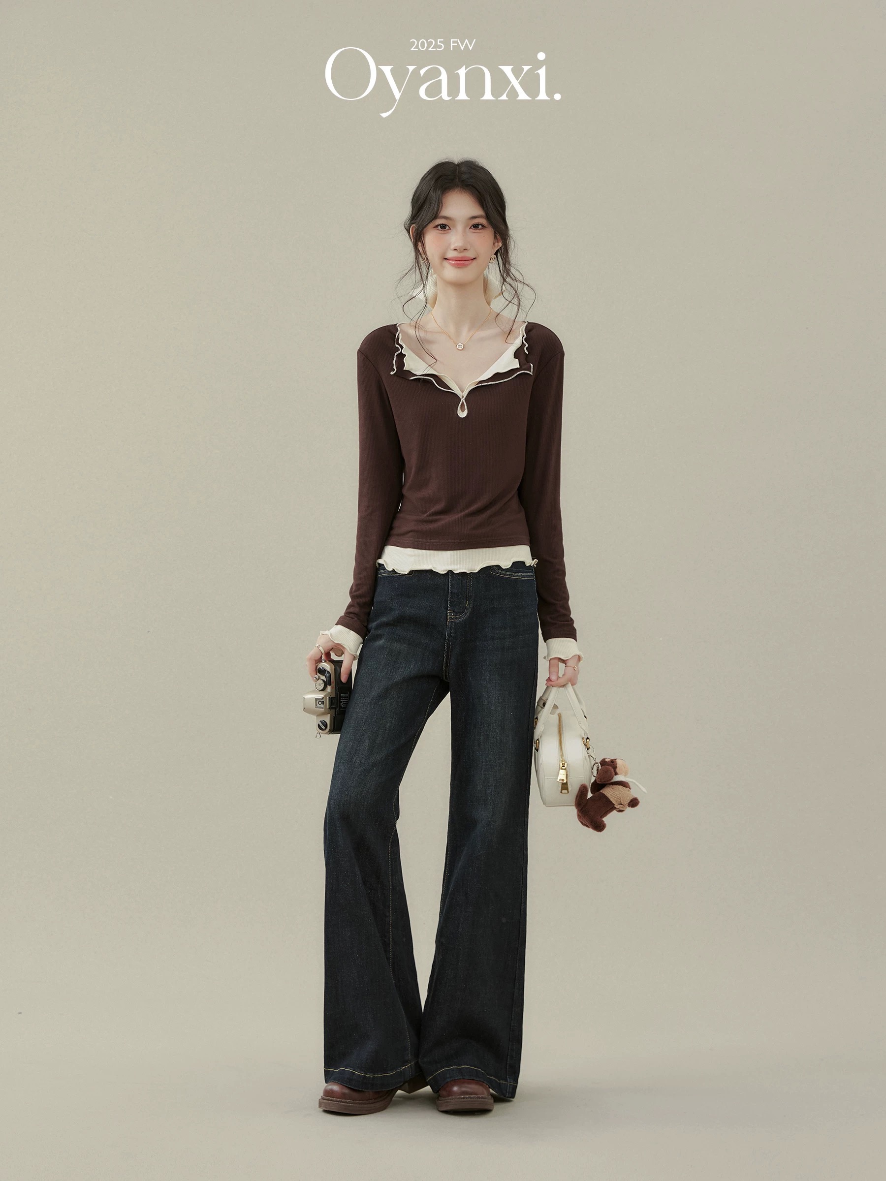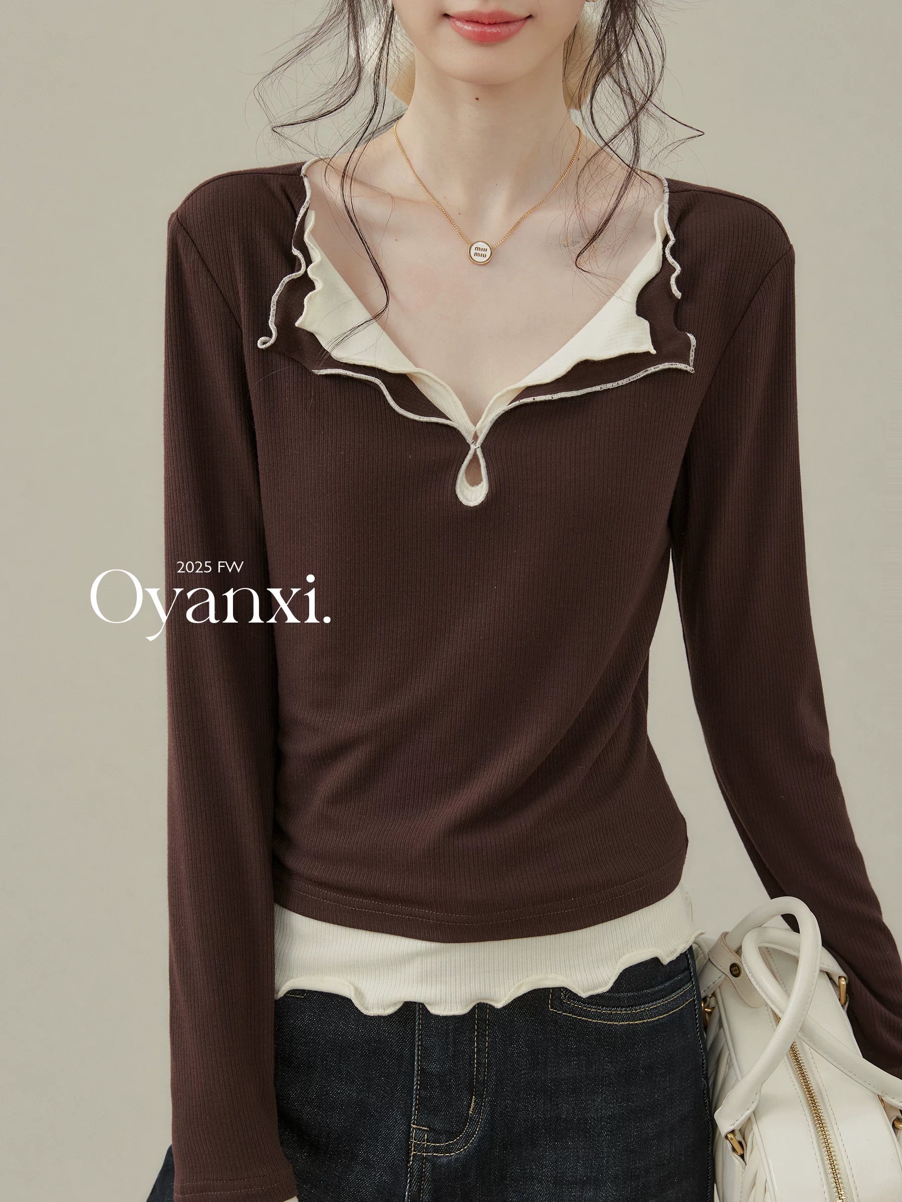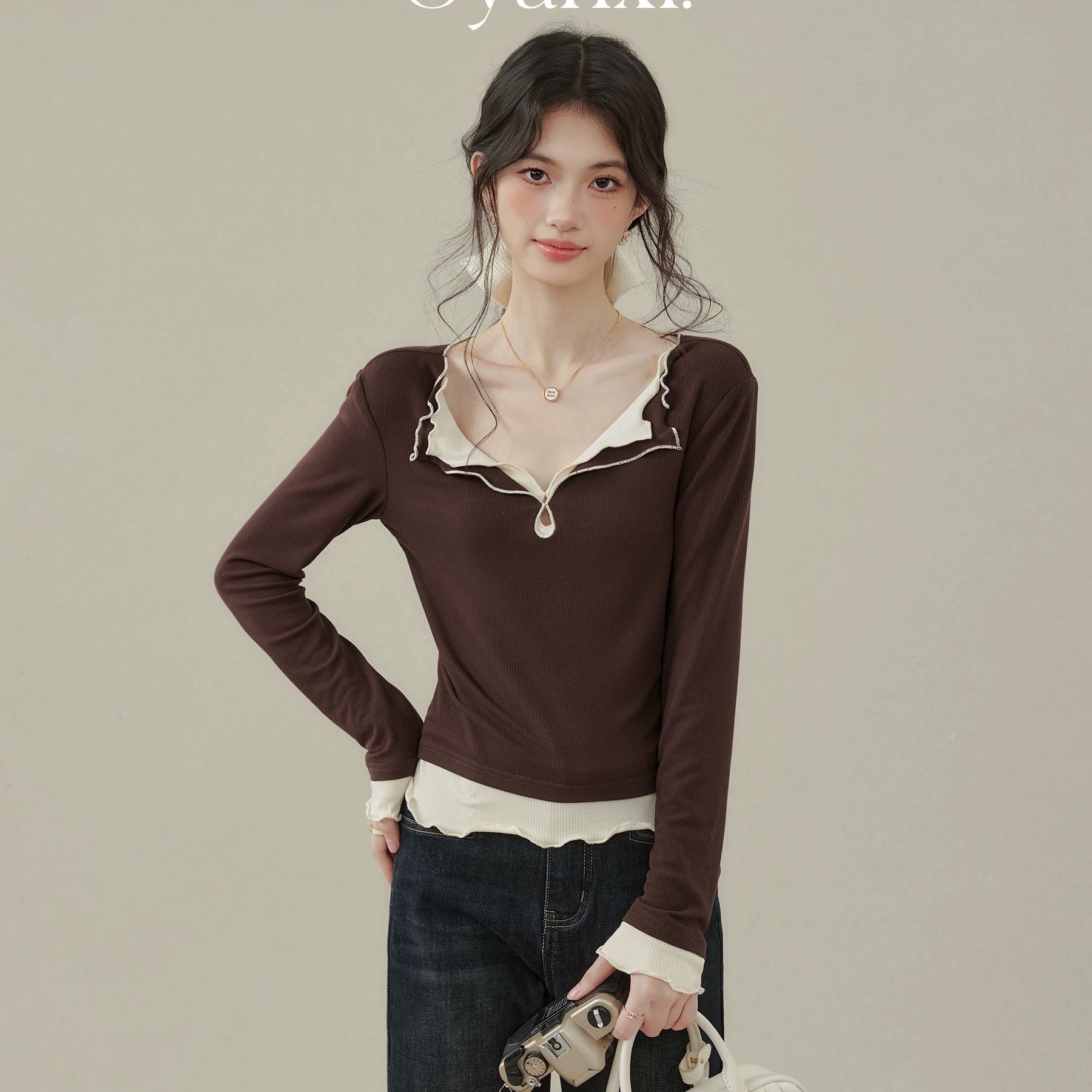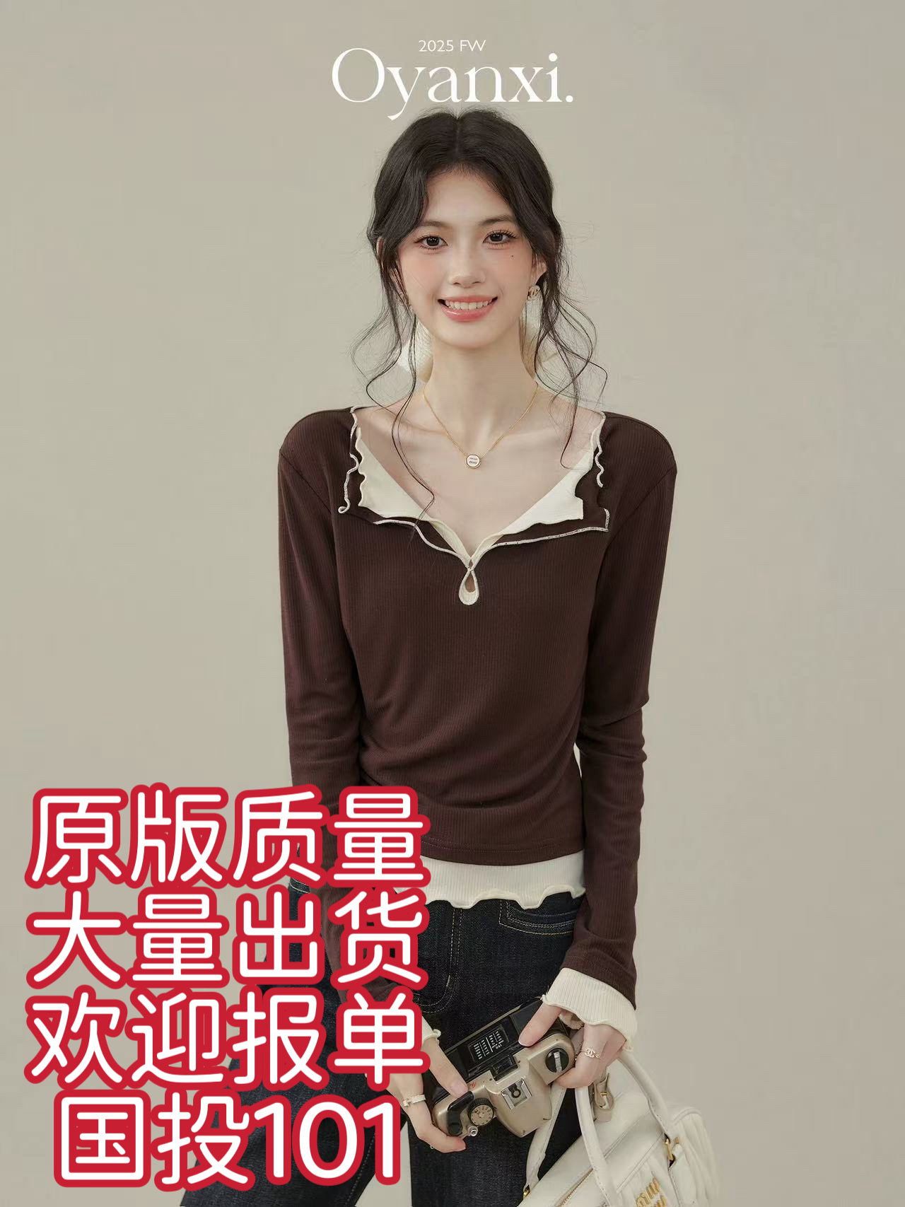 FA43774# 欧阳喜黄油可露丽假两件拼接长袖T恤女早秋季设计感打底上衣 服裝批發女裝批發服飾貨源