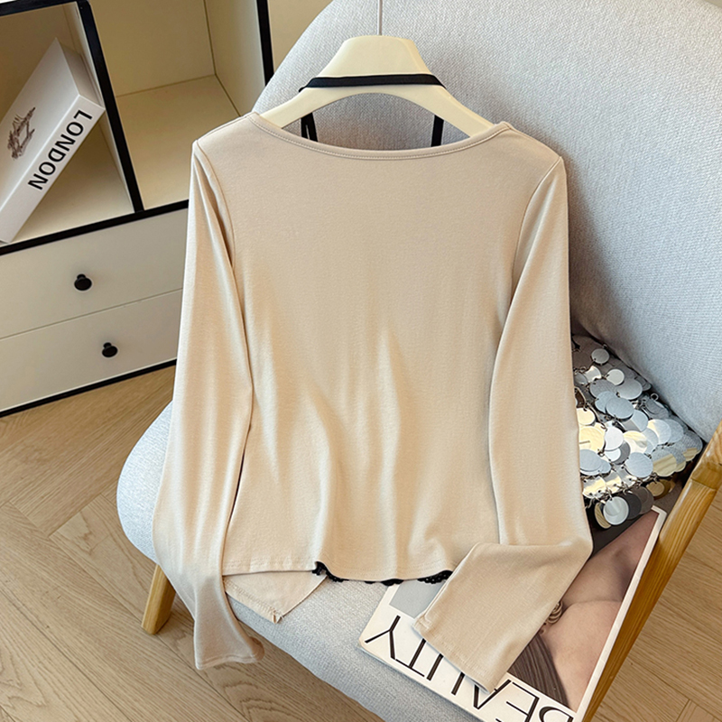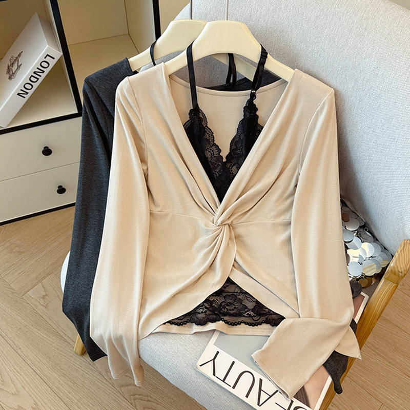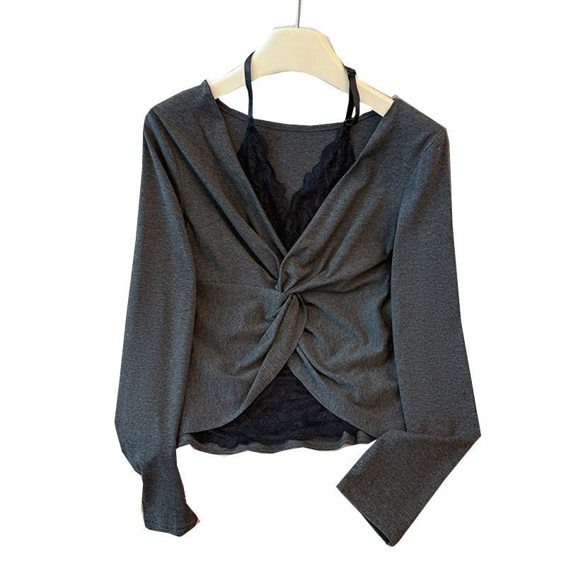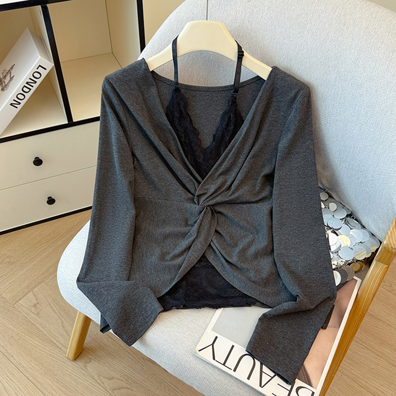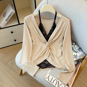 FA43788# 法式纯欲风蕾丝拼接纽结t恤女收腰显瘦假两件打底衫上衣 服裝批發女裝批發服飾貨源