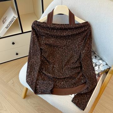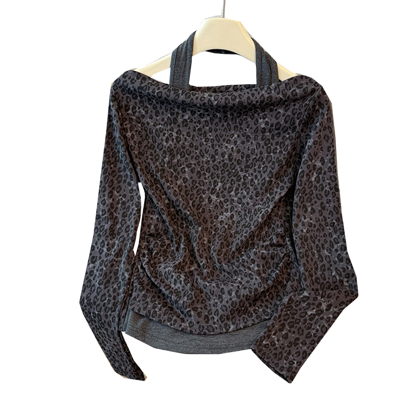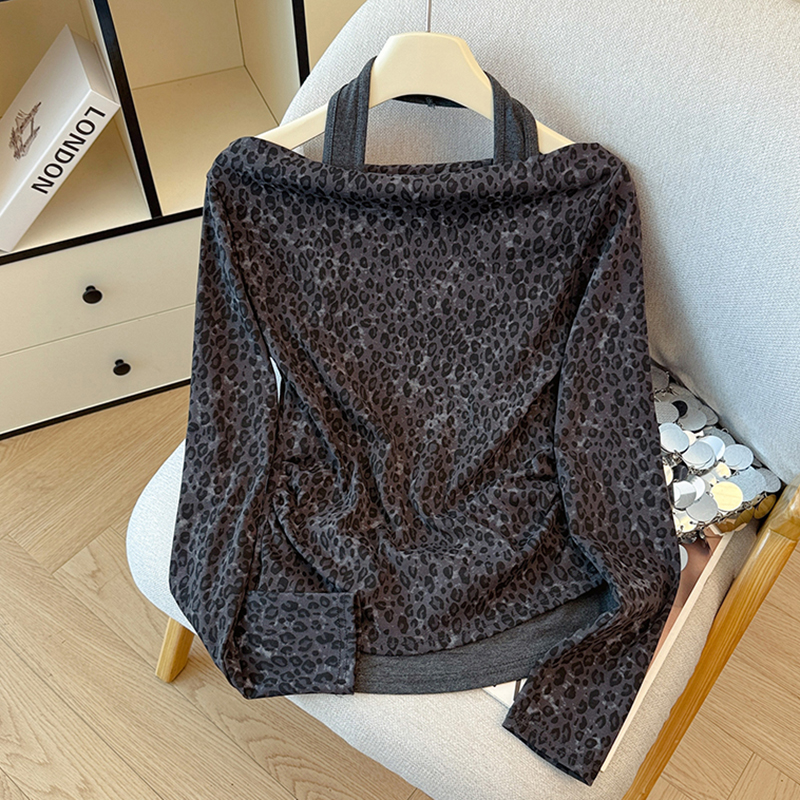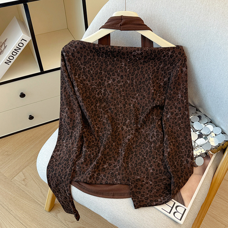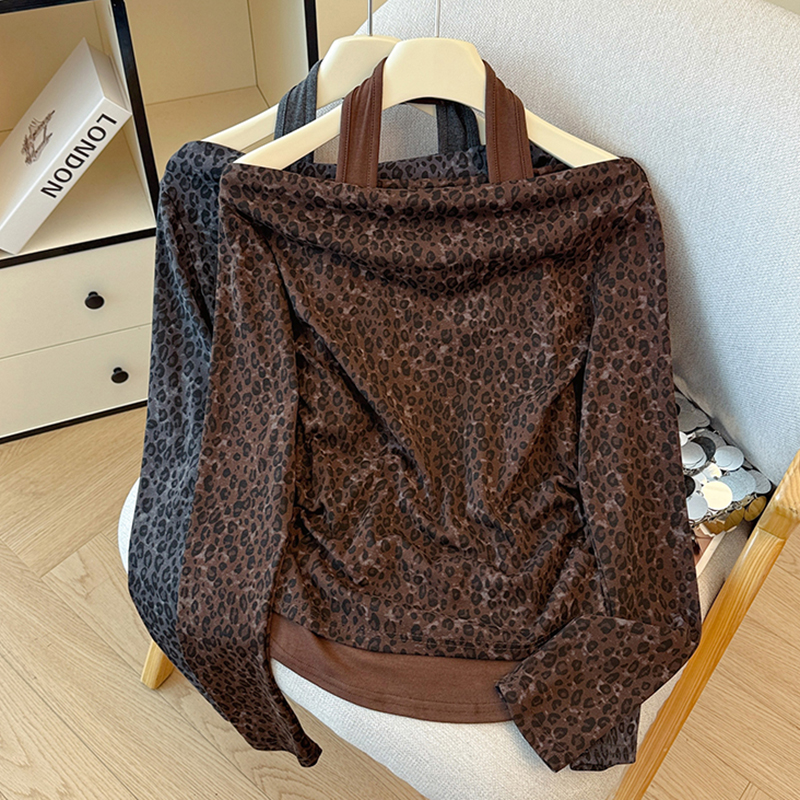 FA43790# 美式复古辣妹豹纹背心假两件长袖T恤女秋新款韩版显瘦上衣 服裝批發女裝批發服飾貨源