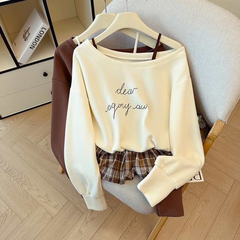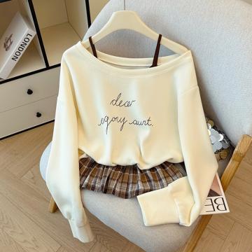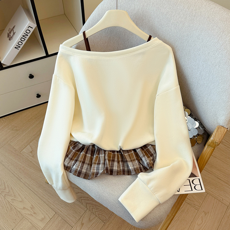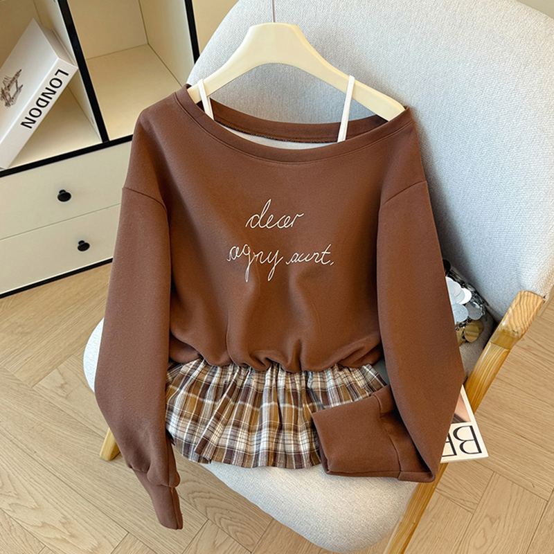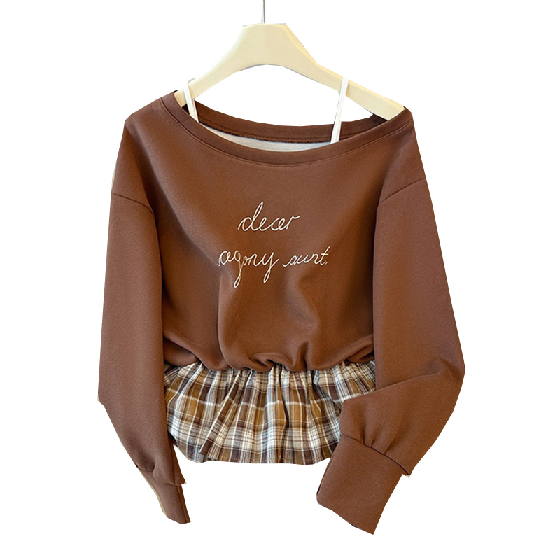 FA43791# 韩系学院风复古吊带印花卫衣拼接格纹荷叶边假两件上衣秋 服裝批發女裝批發服飾貨源