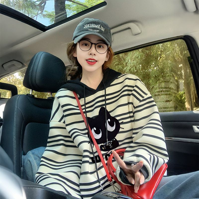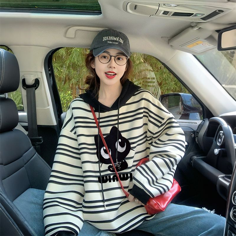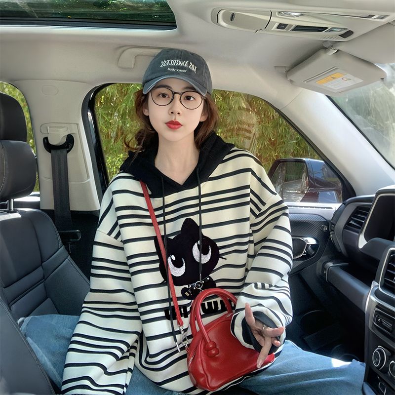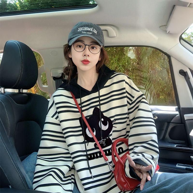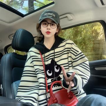 FA43827# 仿华棉复合后包领秋季撞色条纹薄款连帽卫衣女 服裝批發女裝批發服飾貨源