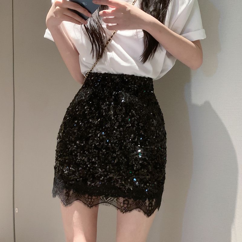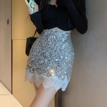 FA43860# 御姐范名媛气质辣妹亮片蕾丝拼接高腰半身裙女夏显瘦A字包臀短裙 服裝批發女裝批發服飾貨源