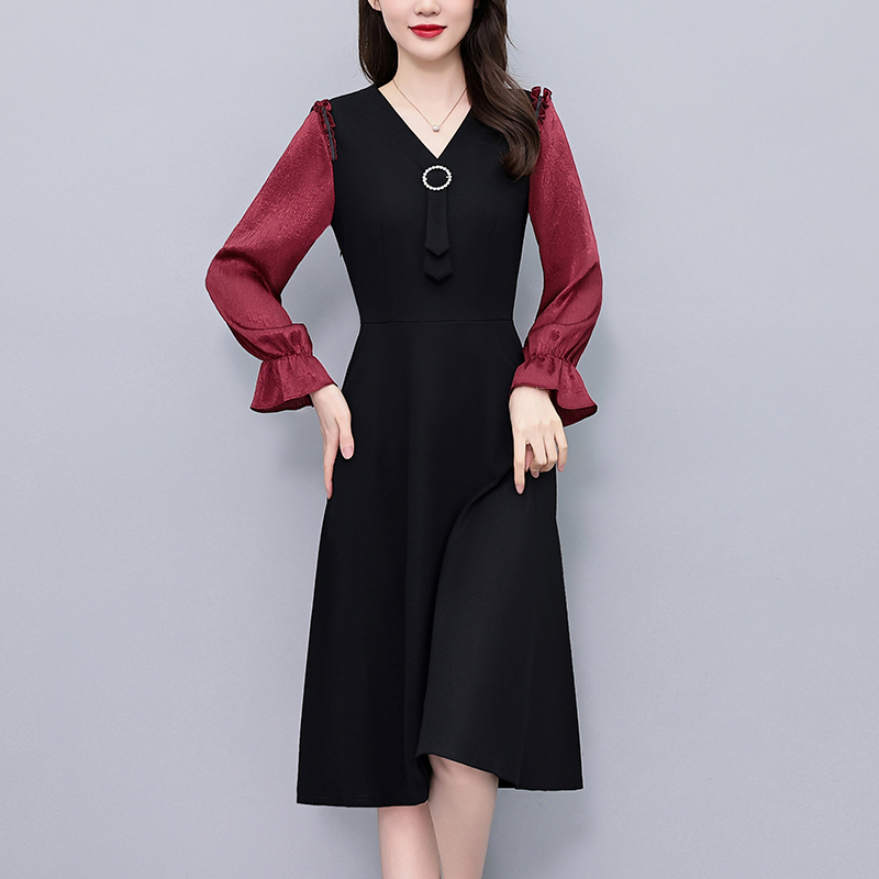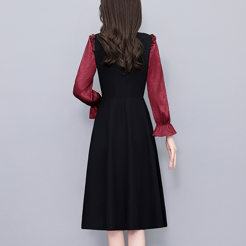 FA43893# 职场气质假两件套拼色修身中长款大码女装胖mm长袖连衣裙春秋新款 服裝批發女裝批發服飾貨源