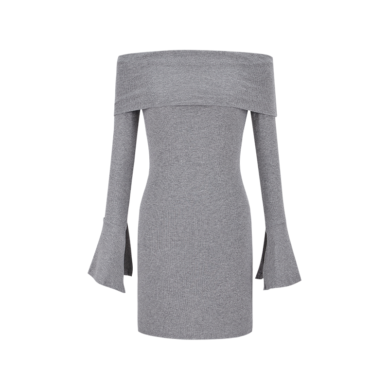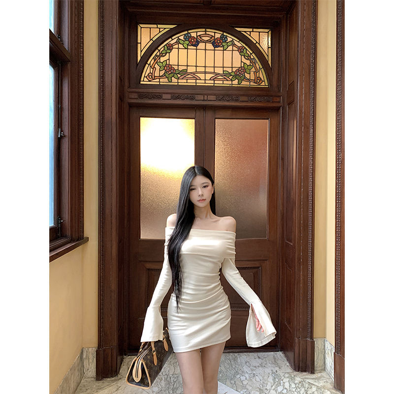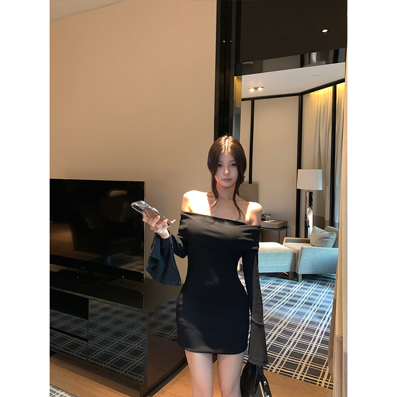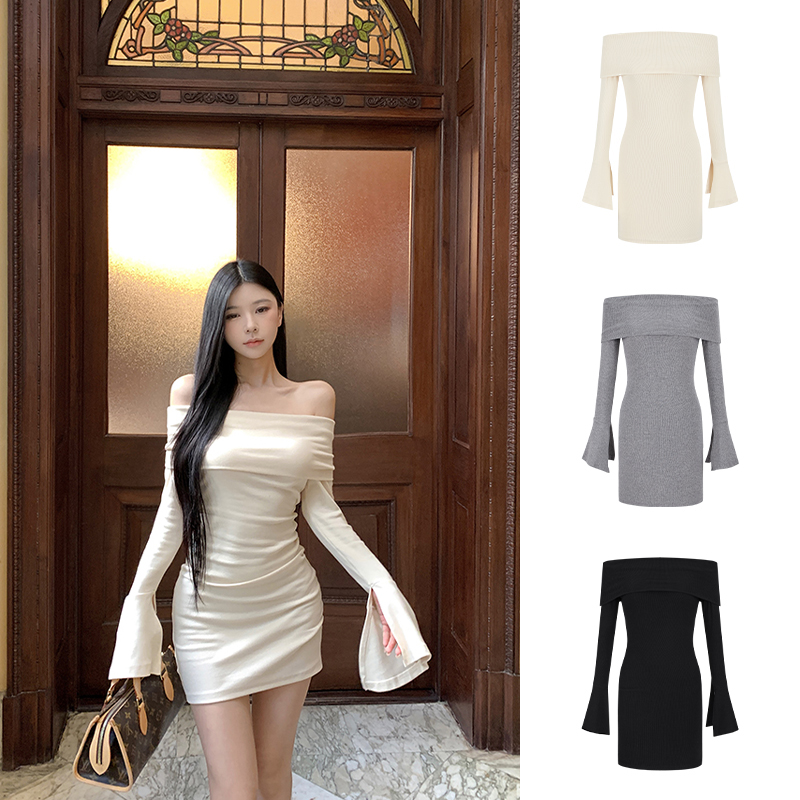 FA43951# 一字肩长袖连衣裙女秋季收腰显瘦包臀短裙 服裝批發女裝批發服飾貨源