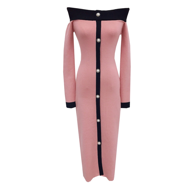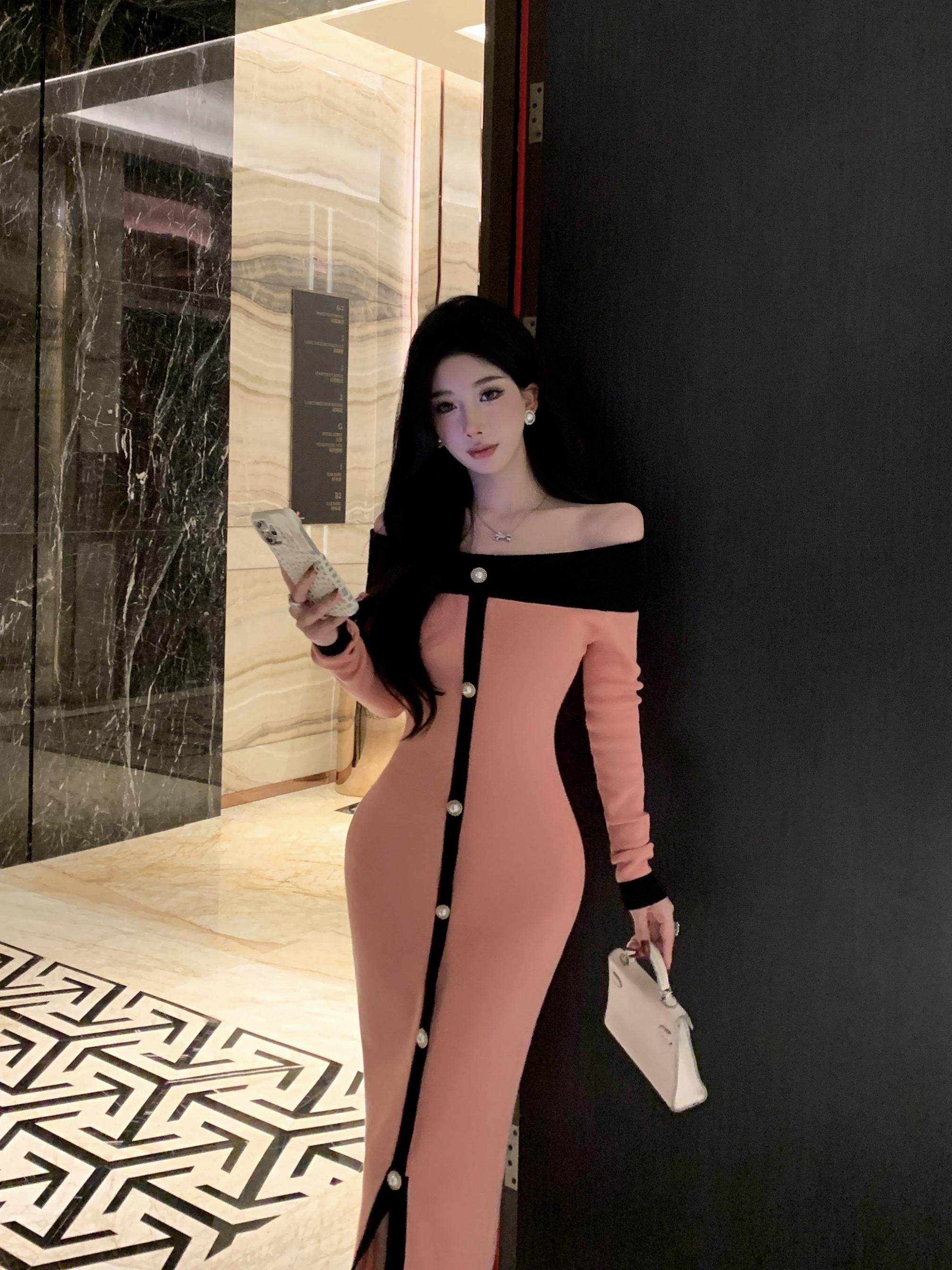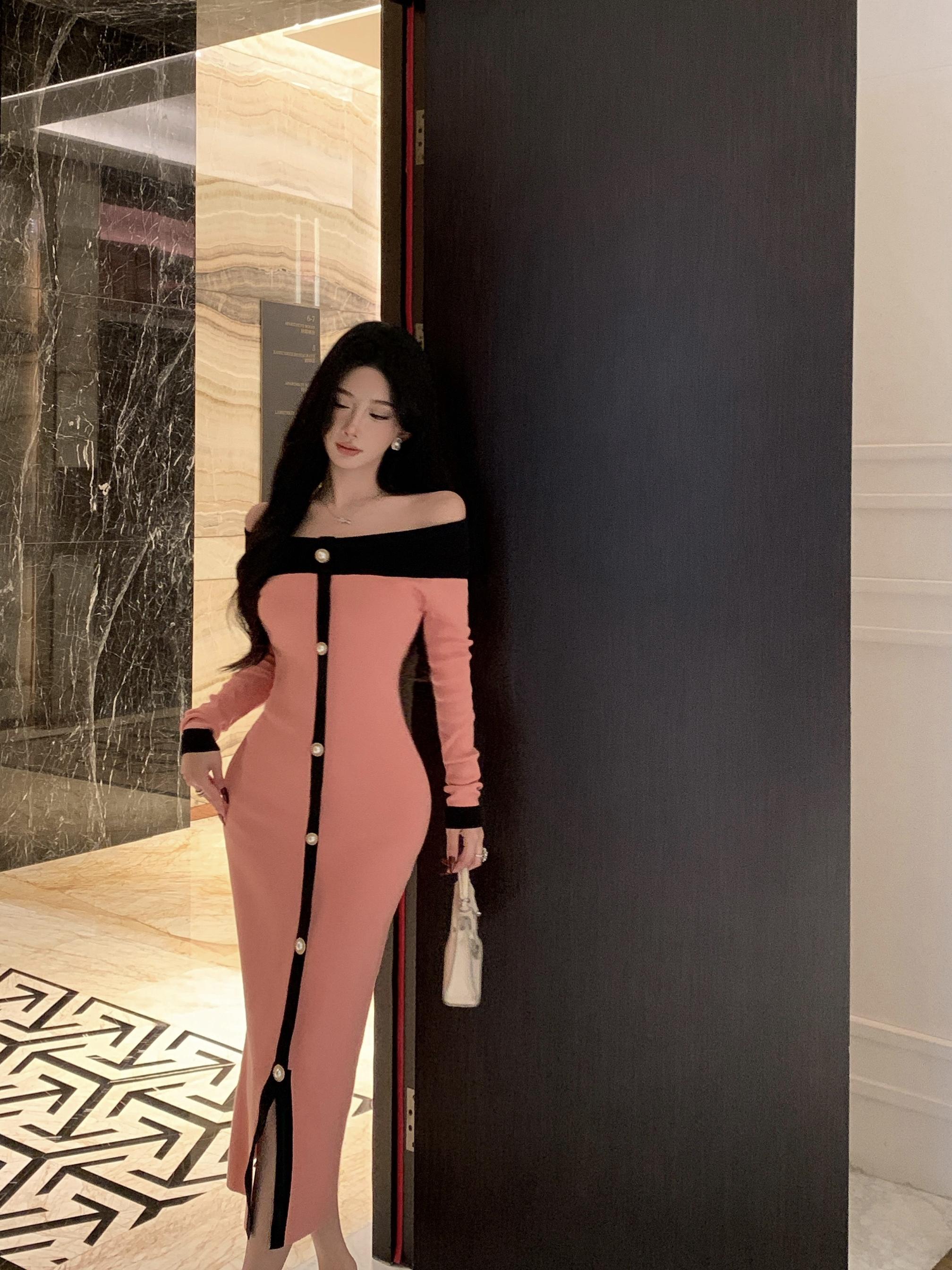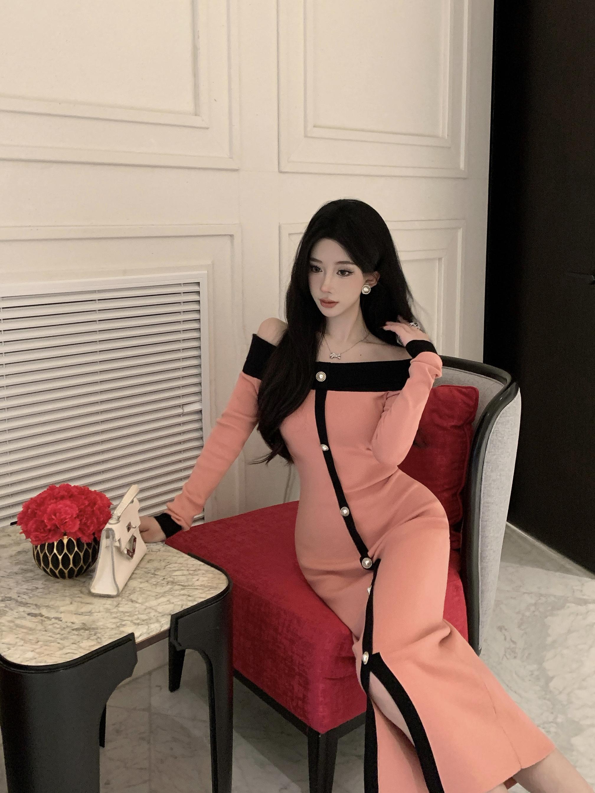 FA43963# 秋冬圣诞新年红名媛撞色修身针织长款连衣裙女 服裝批發女裝批發服飾貨源