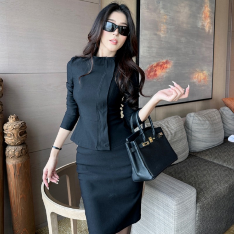 FA43979# 韩系新款秋季通勤高领工装外套上衣女装包臀半身裙两件套套装 服裝批發女裝批發服飾貨源