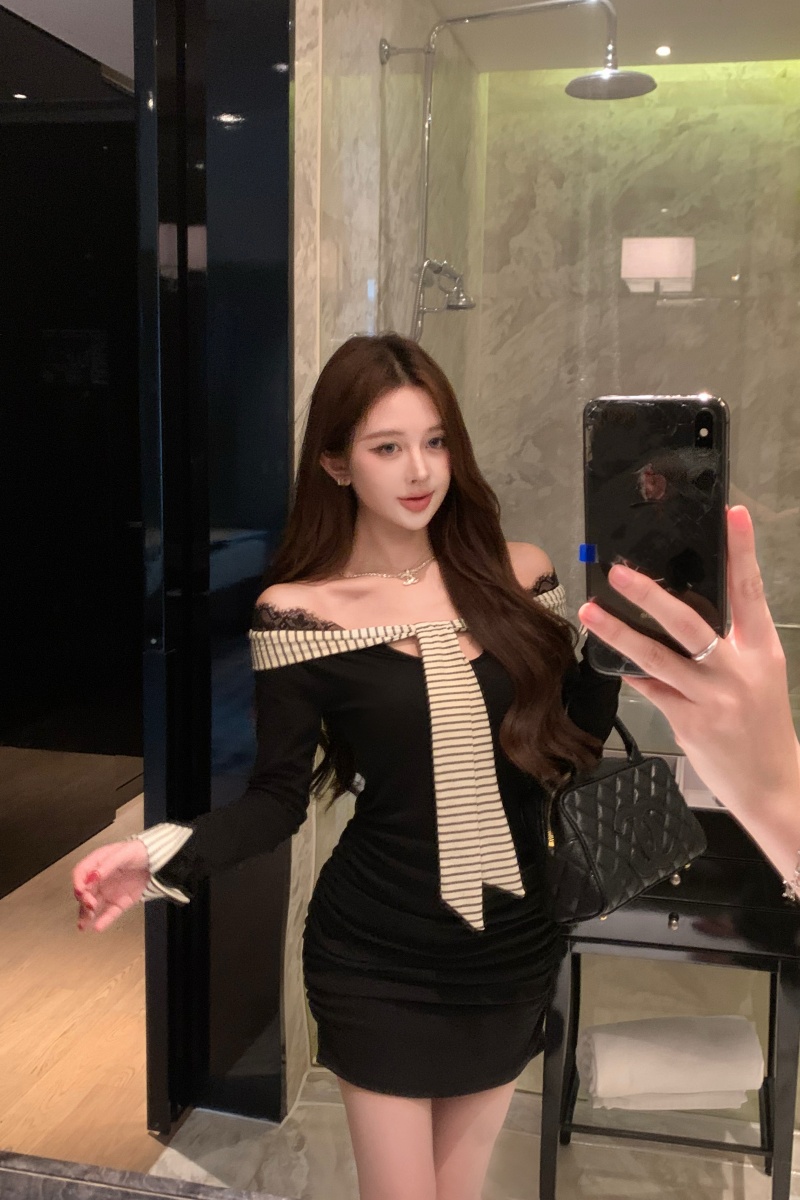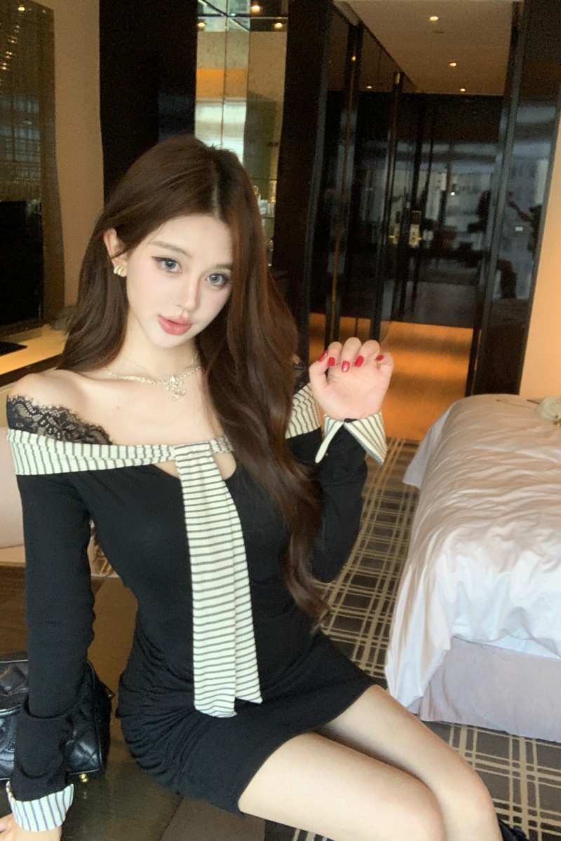Home > 夜店裙、长袖连衣裙 > FA44017# 辣妹设计感条纹蕾丝性感连衣裙秋季假两件显瘦 服裝批發女裝批發服飾貨源