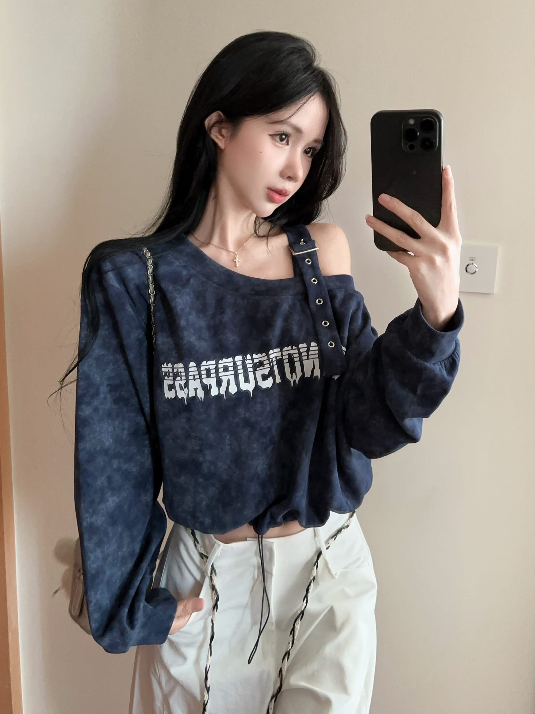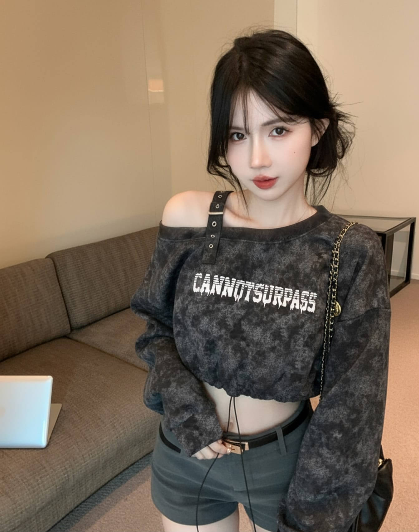 FA44029# 露肩长袖卫衣抽绳松紧收腰设计感小众宽松短款上衣外套 服裝批發女裝批發服飾貨源