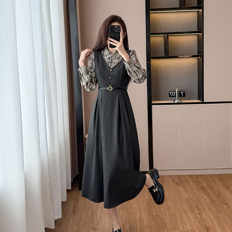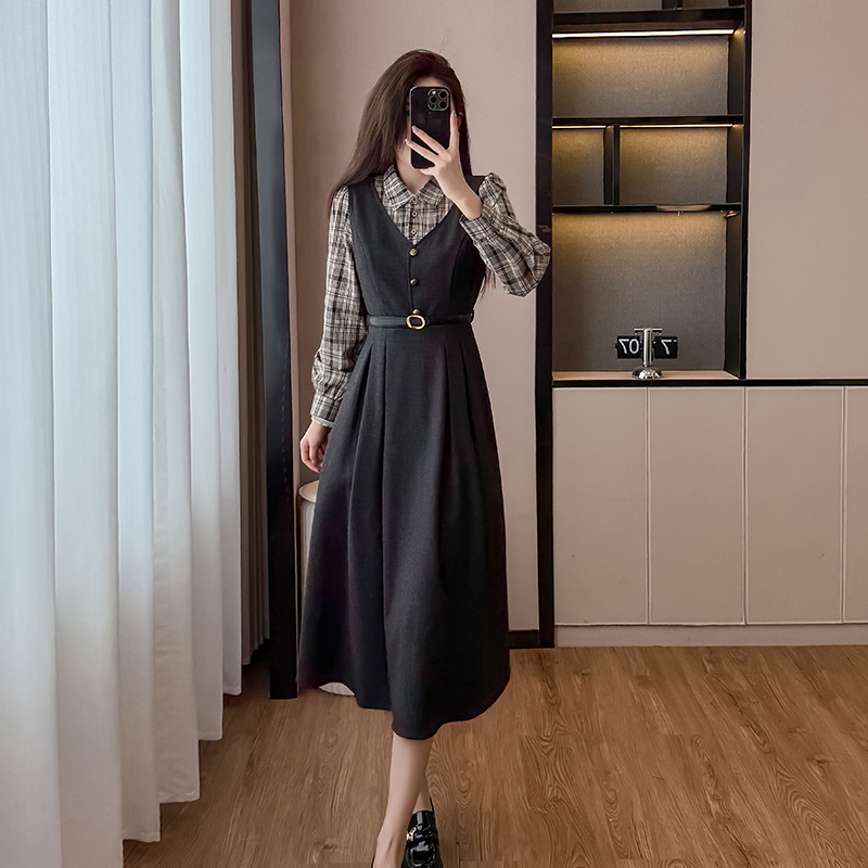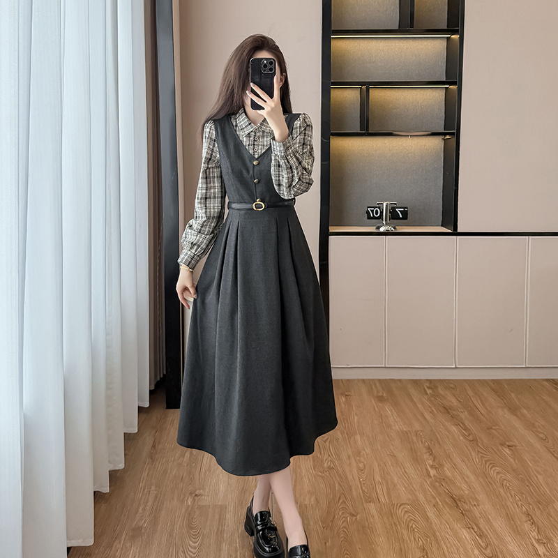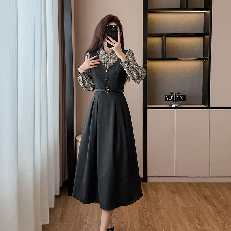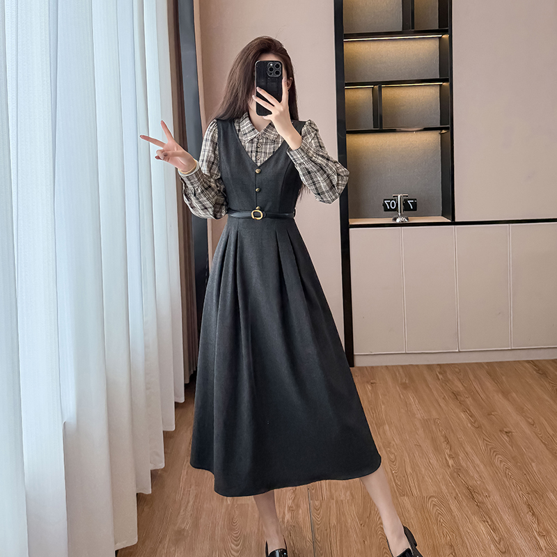 Home > 夜店裙、长袖连衣裙 > FA44107# 新款秋冬法式长袖衬衫连衣裙女显瘦高级假两件格子长裙 服裝批發女裝批發服飾貨源
