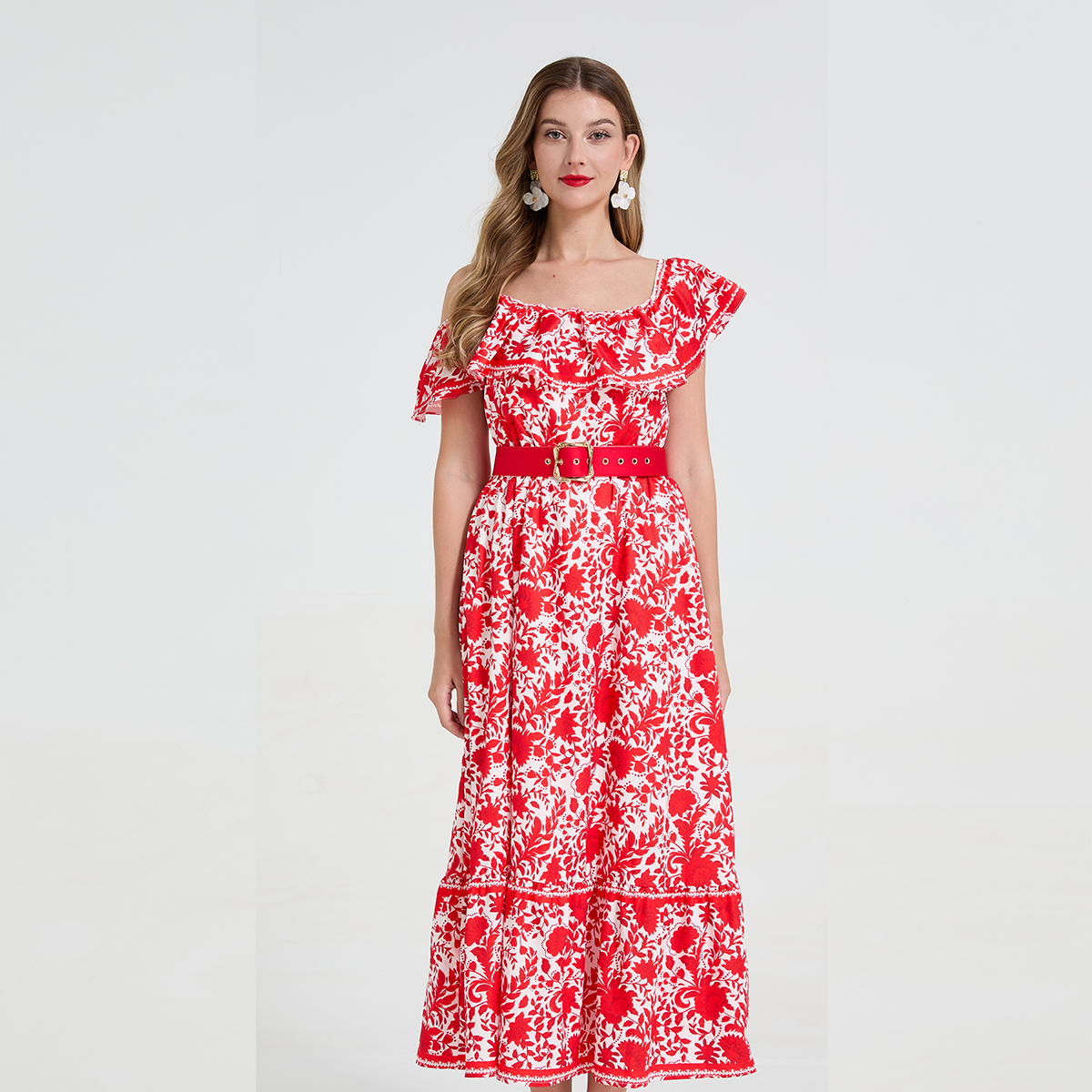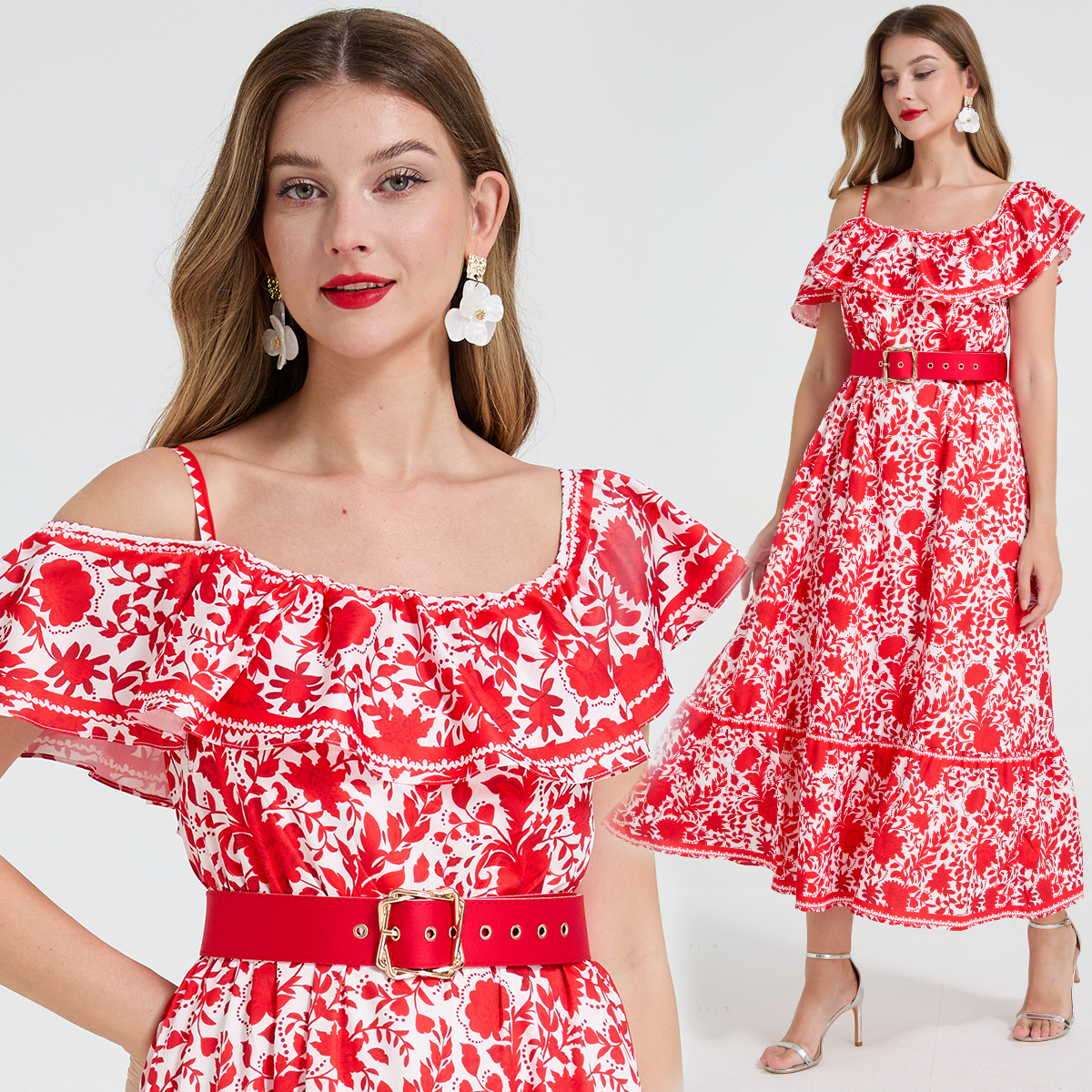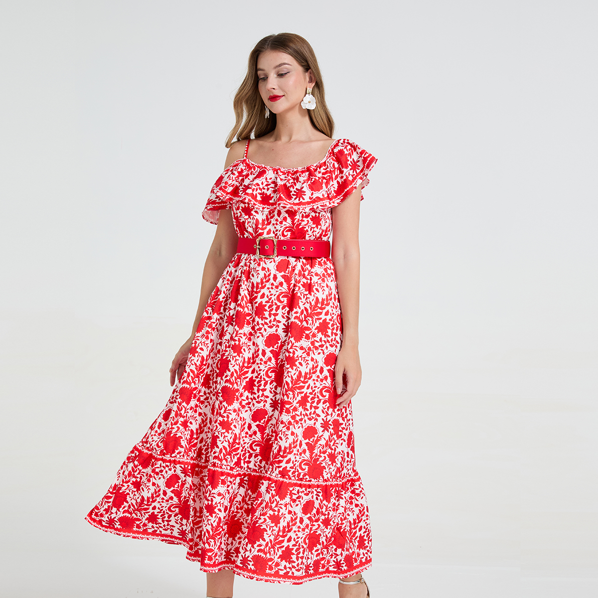FA44139# 复古风气质不对称设计露肩吊带荷叶边收腰显瘦大摆长裙 服裝批發女裝批發服飾貨源