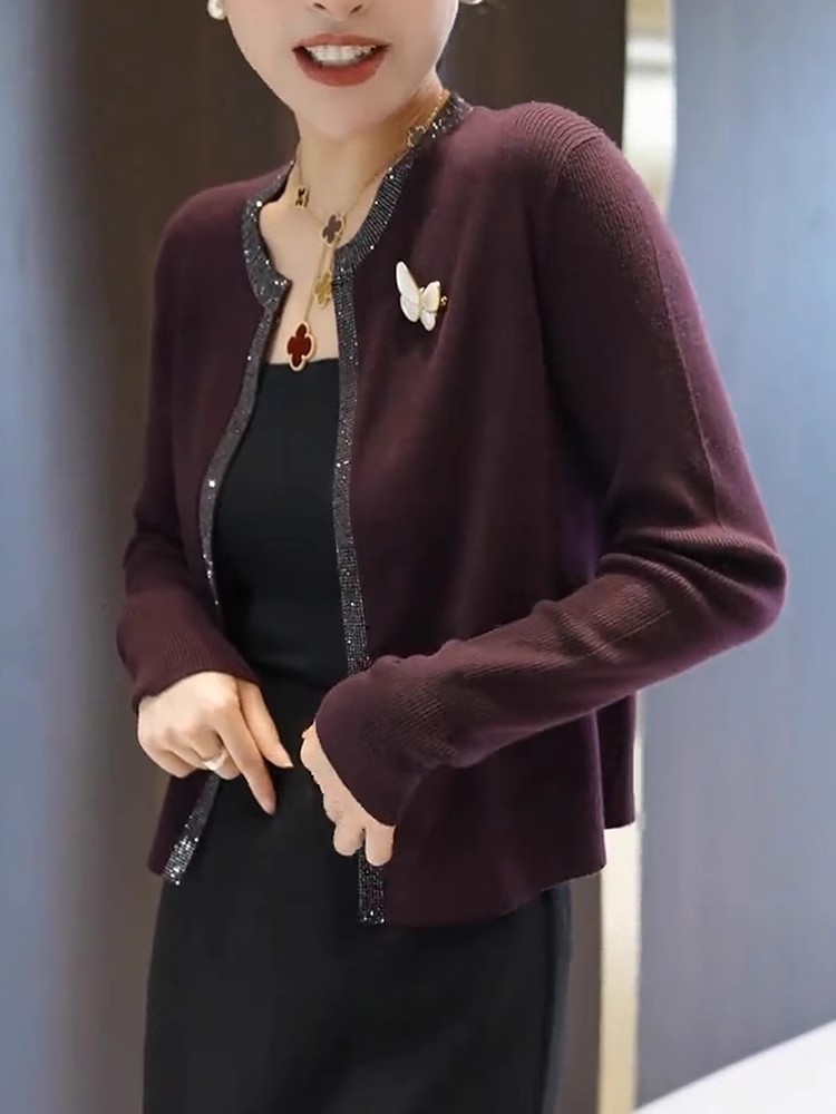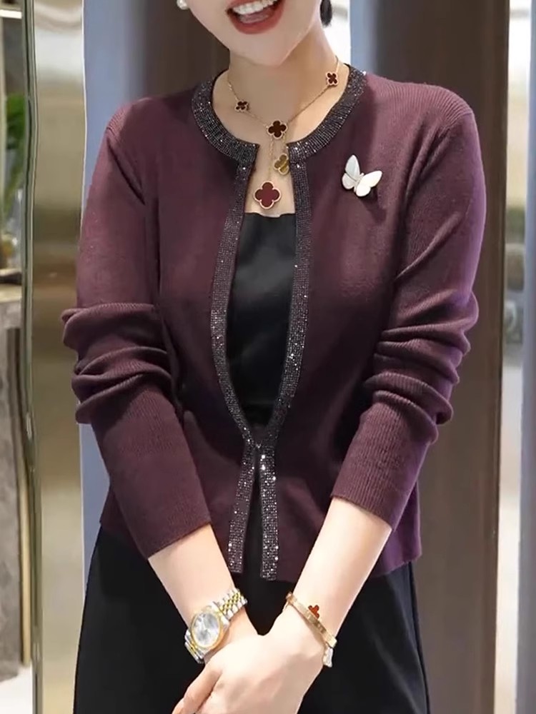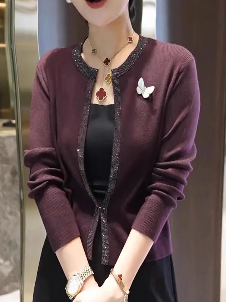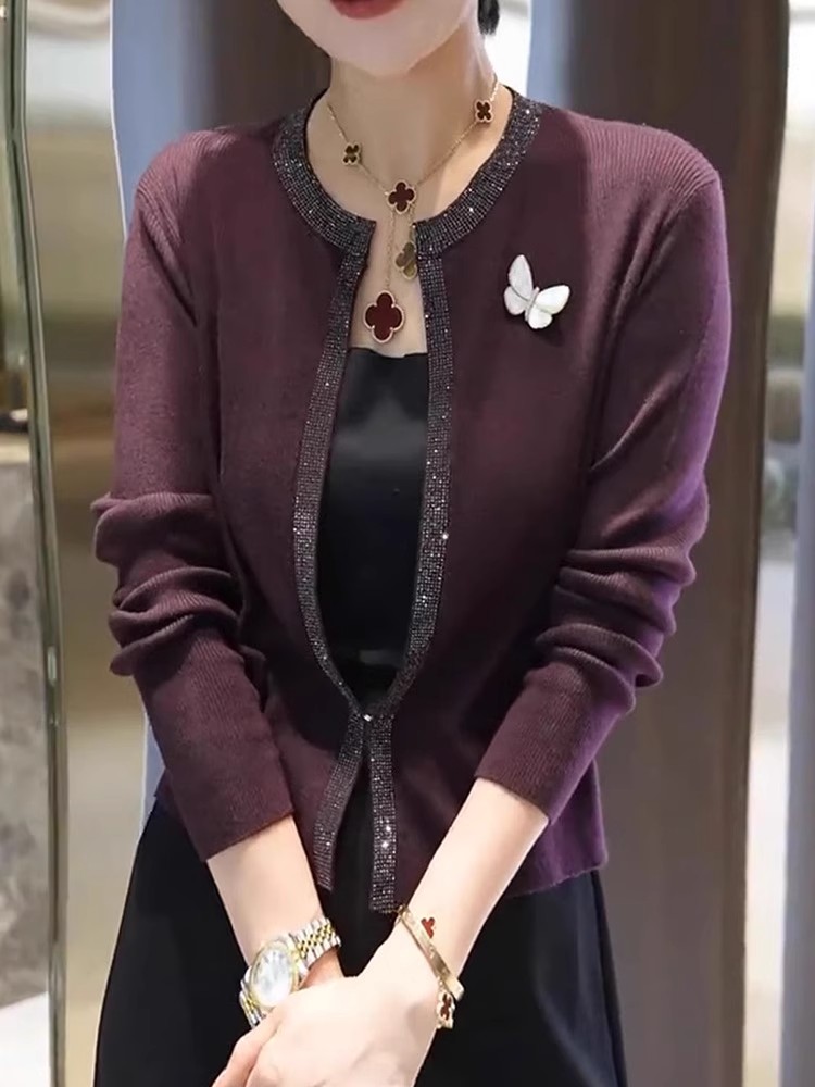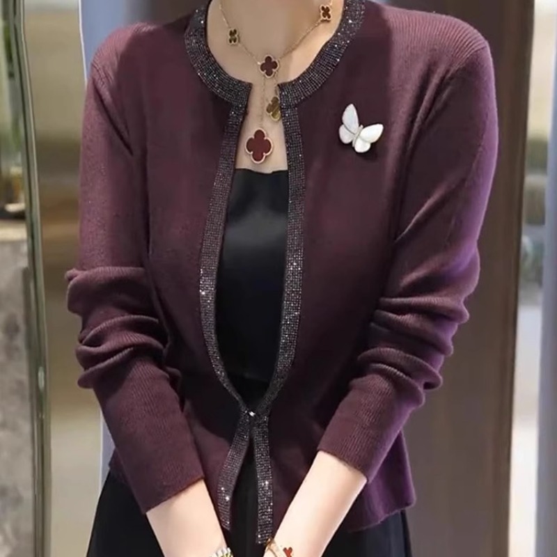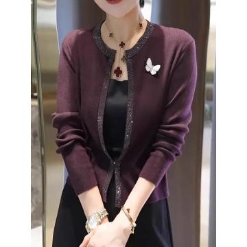 FA44163# 气质端庄紫色高级烫钻设计长袖针织开衫女秋季新款大码上衣潮 服裝批發女裝批發服飾貨源