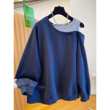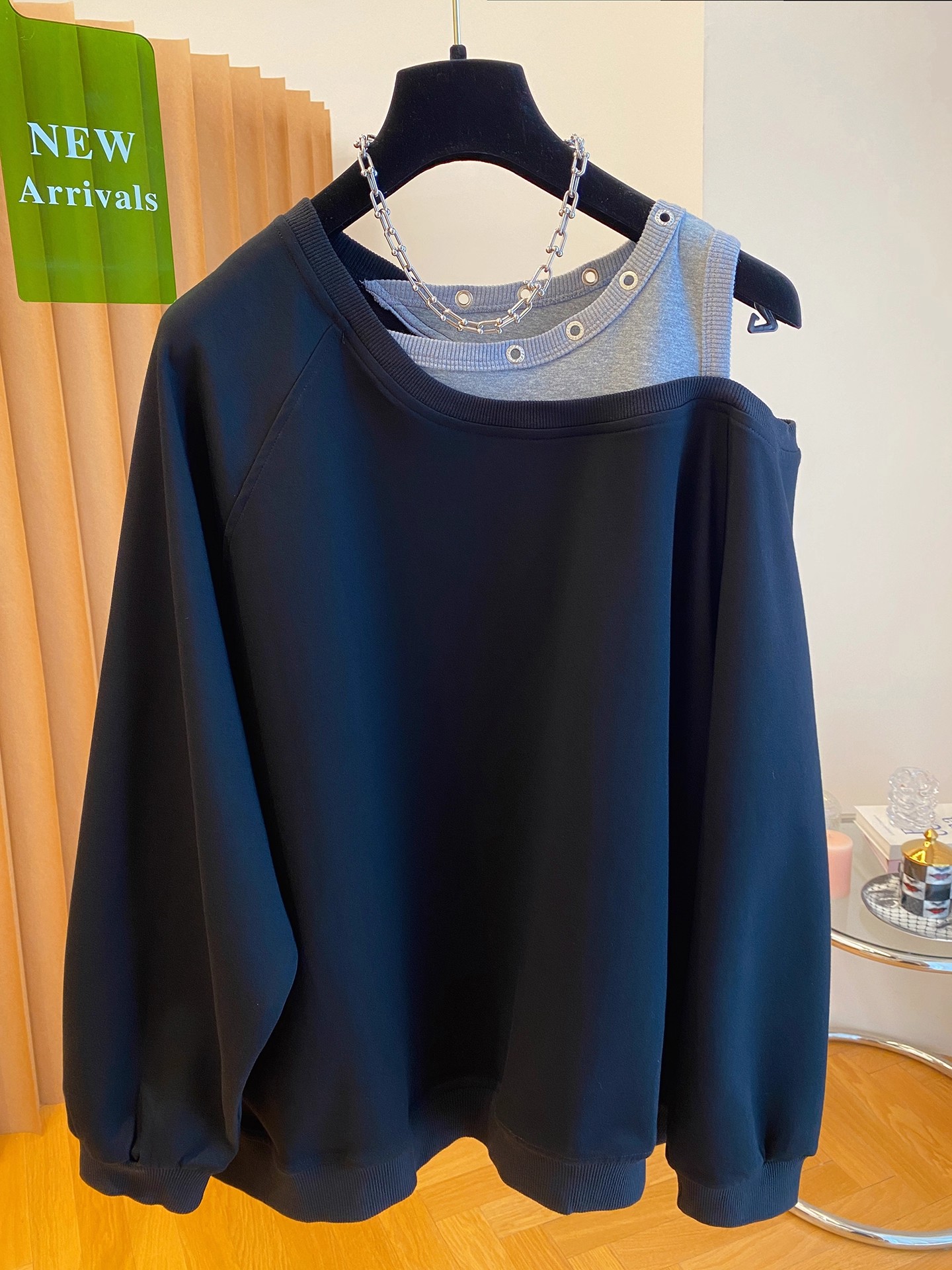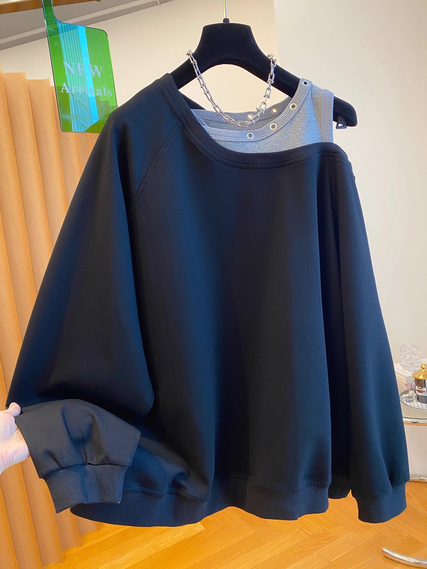 FA44213# 原版质量特大码300斤假两件斜肩露肩卫衣女秋季款上衣 服裝批發女裝批發服飾貨源