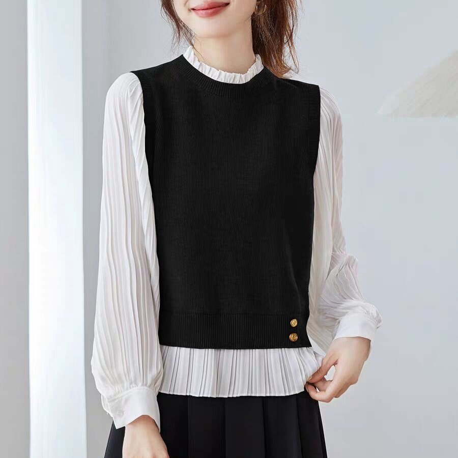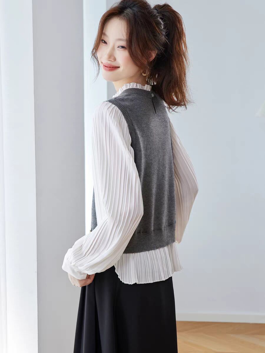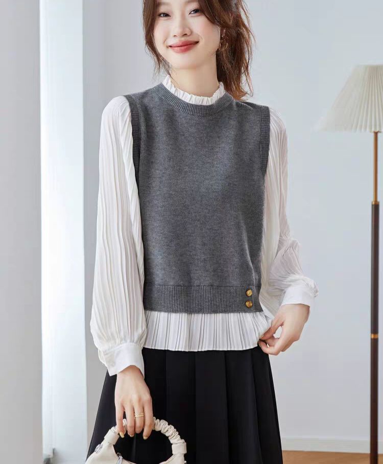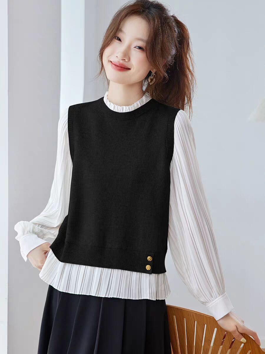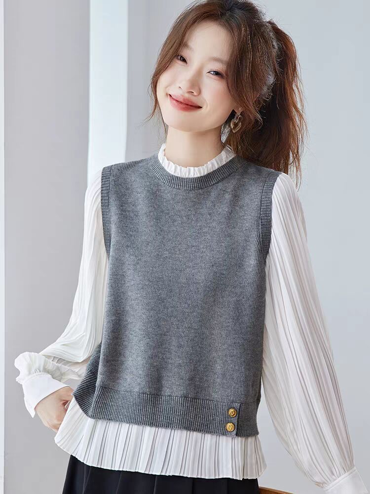 FA44222# 假两件衬衫拼接针织衫女秋季新款设计感超火减龄长袖上衣 服裝批發女裝批發服飾貨源