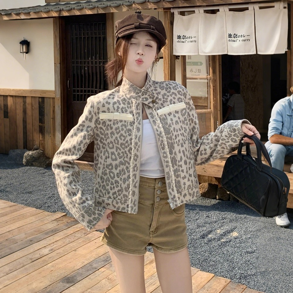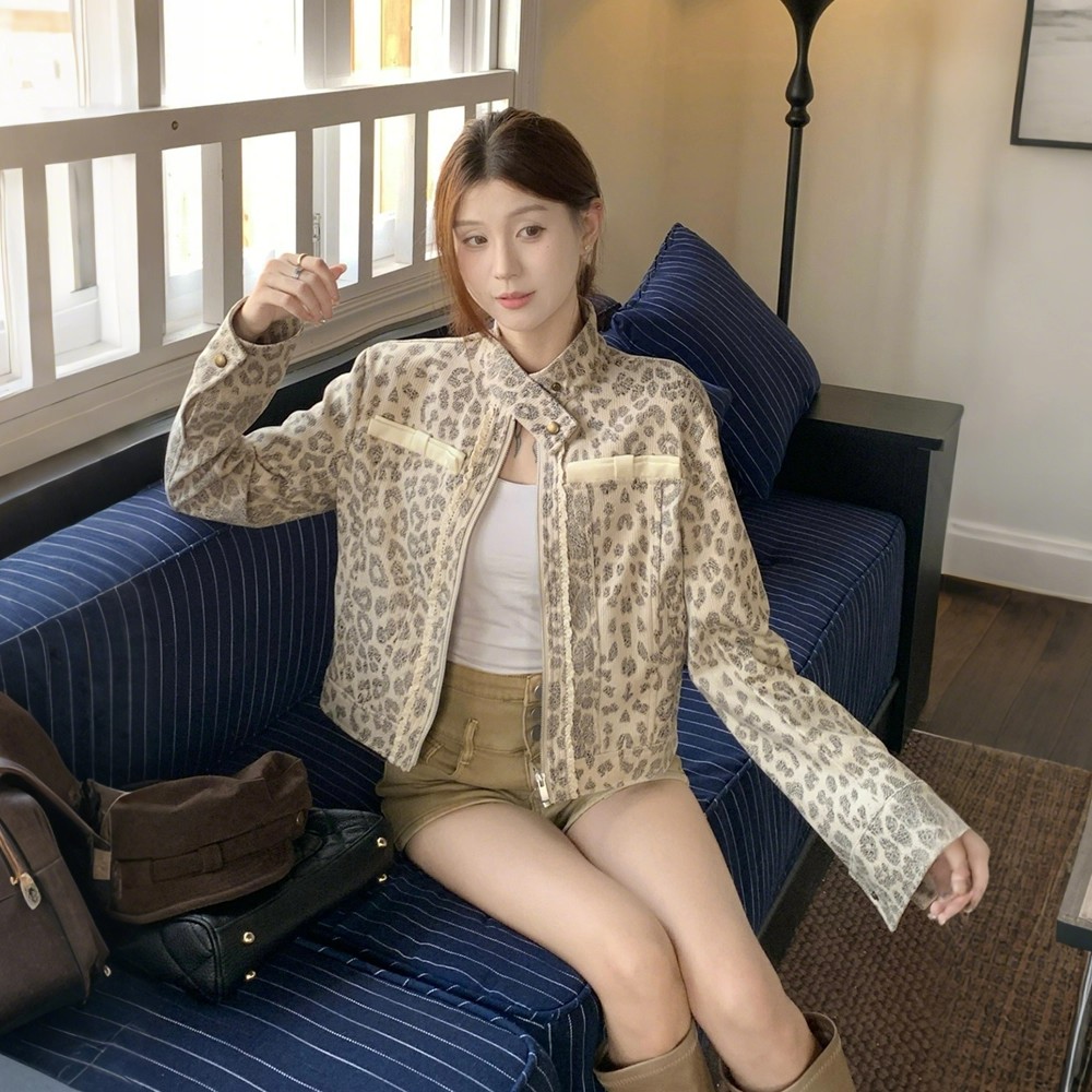 FA44233# 美式复古豹纹机车夹克外套女秋季小个子做旧定染立领短款开衫上衣 服裝批發女裝批發服飾貨源