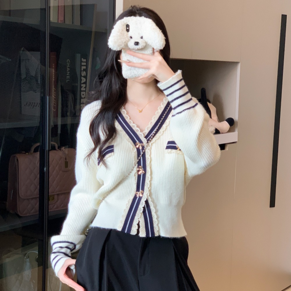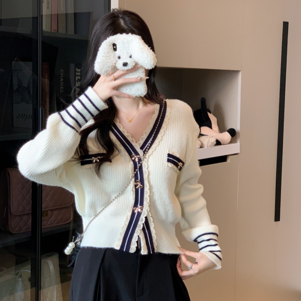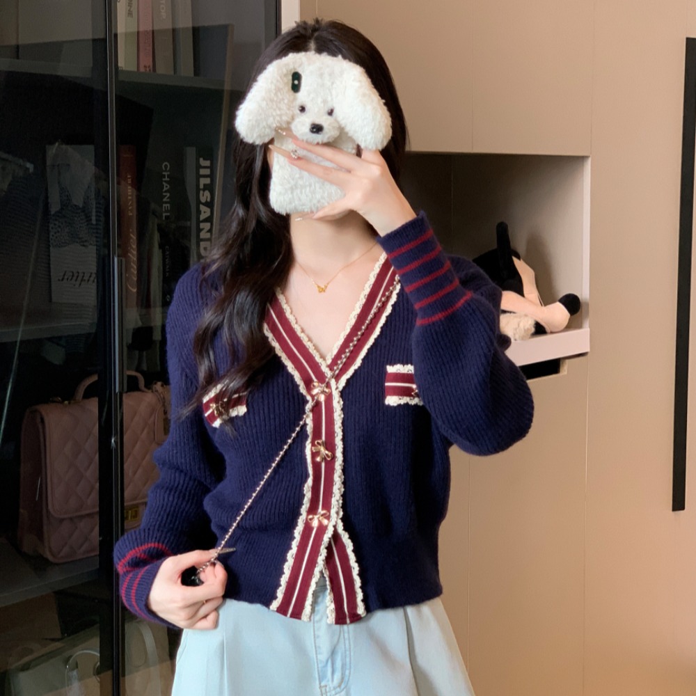 FA44258# 小香风拼接撞色V领加厚保暖针织开衫竖坑条毛衣外套上衣 服裝批發女裝批發服飾貨源