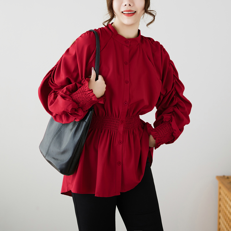 港风设计感精致泡泡袖褶皱衬衫纯色显瘦百搭上衣女潮 服裝批發女裝批發服飾貨源