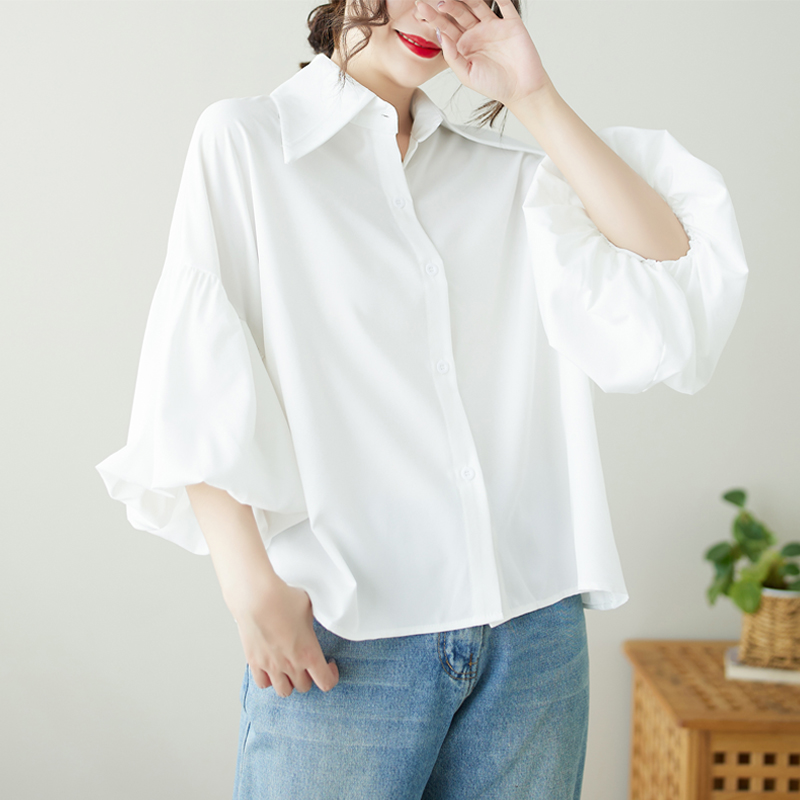 韩版个性花苞袖翻领衬衫百搭藏肉大码简约纯色上衣女潮 服裝批發女裝批發服飾貨源