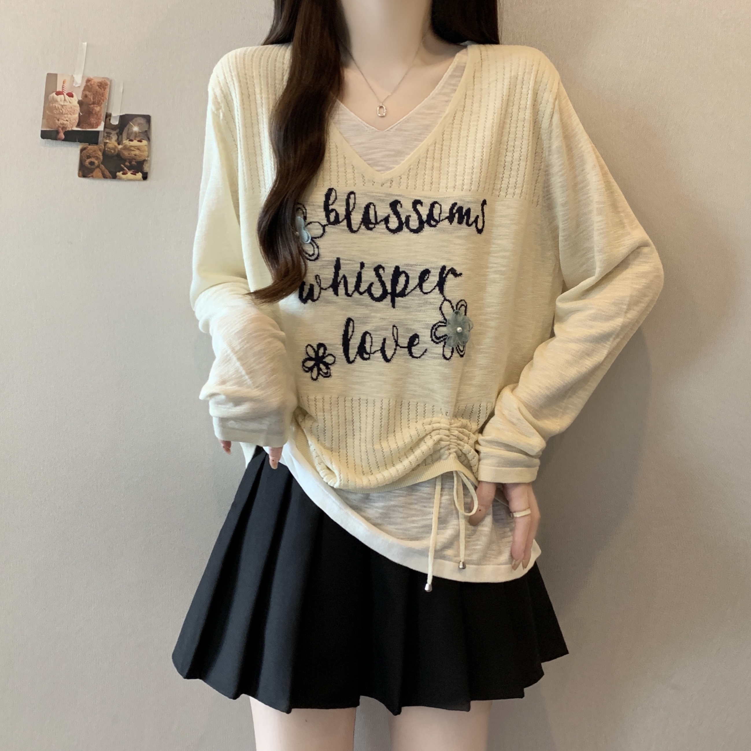 大码韩系别致针织衫女秋新款字母印花V领假两件抽绳上衣 服裝批發女裝批發服飾貨源