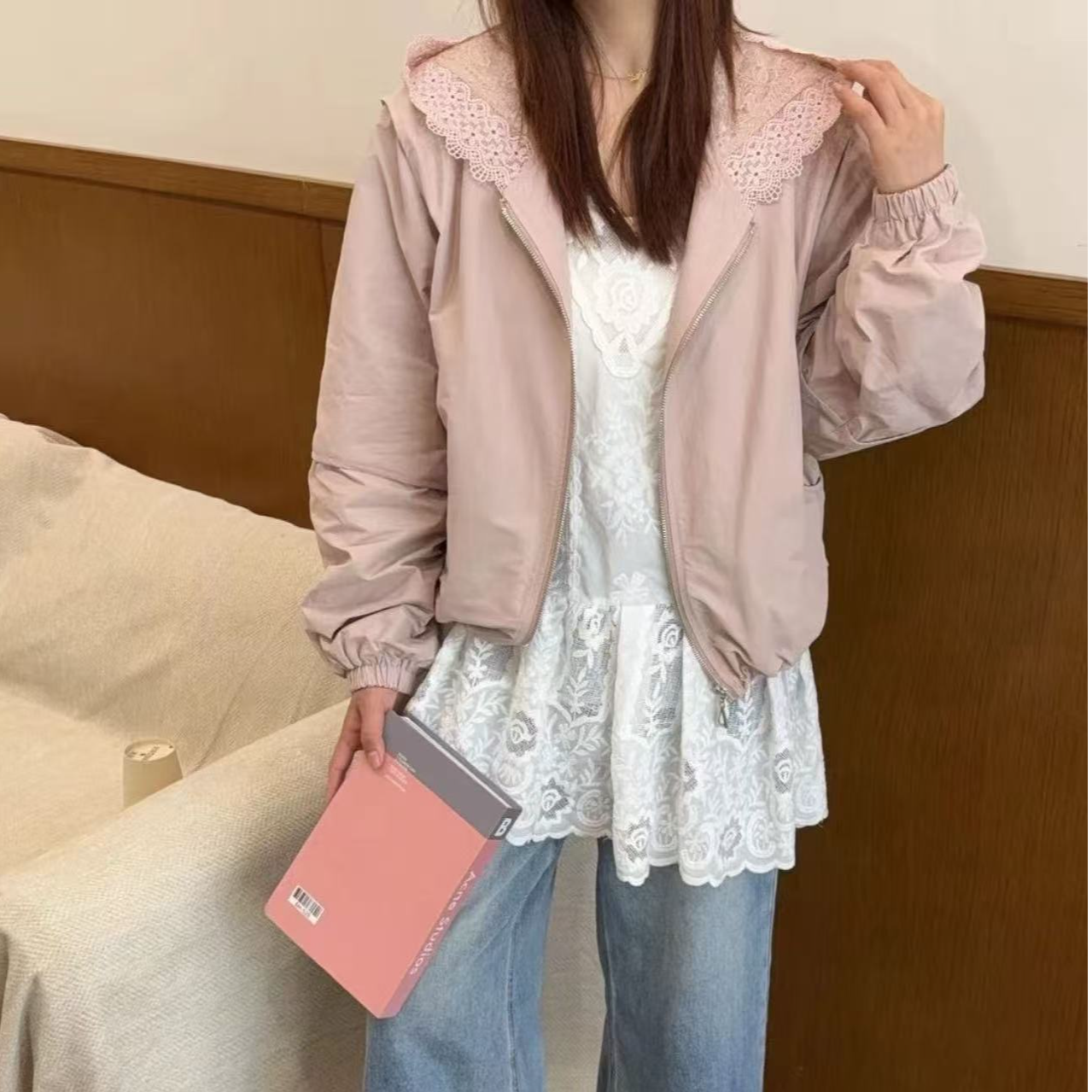 FA44296# 韩版蕾丝拼接连帽短外套女薄款春秋季新款时尚百搭显瘦防晒上衣 服裝批發女裝批發服飾貨源