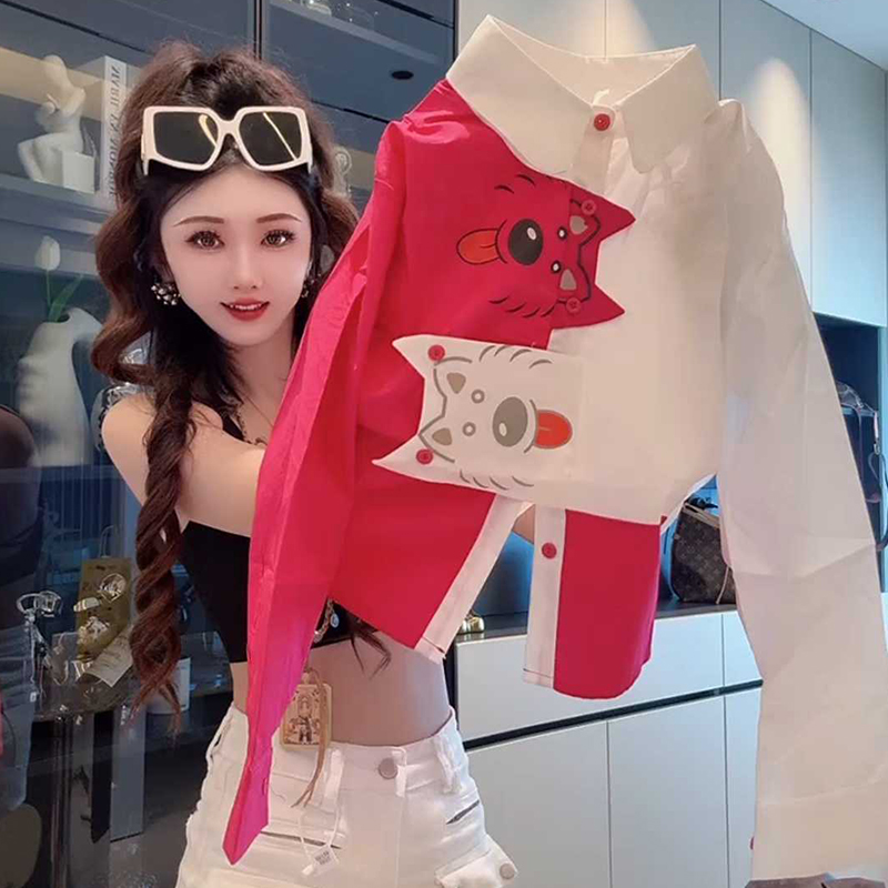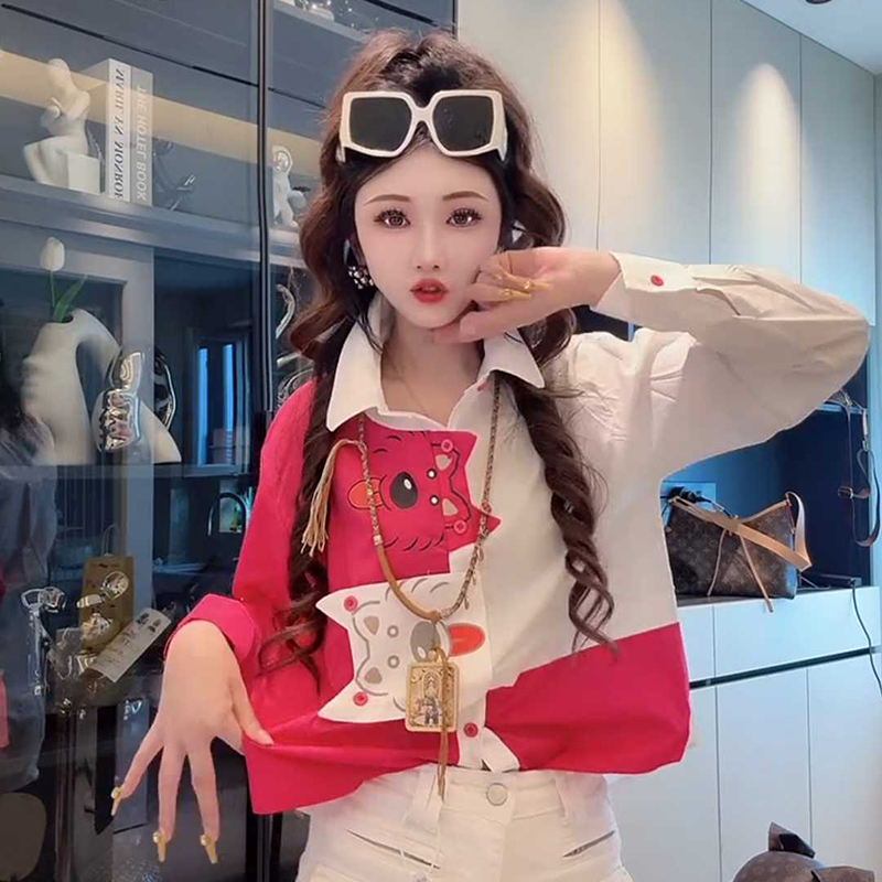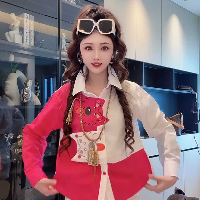 卡通猫咪撞色拼接长袖衬衫女秋季宽松洋气百搭时尚减龄上衣 服裝批發女裝批發服飾貨源