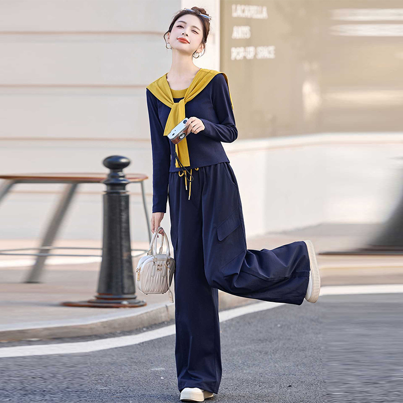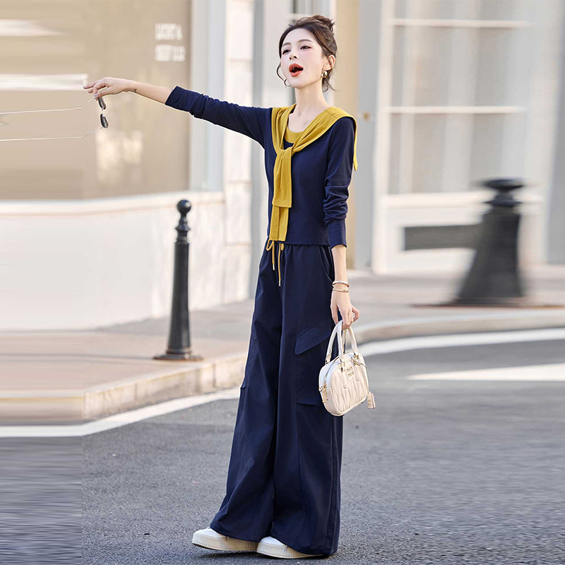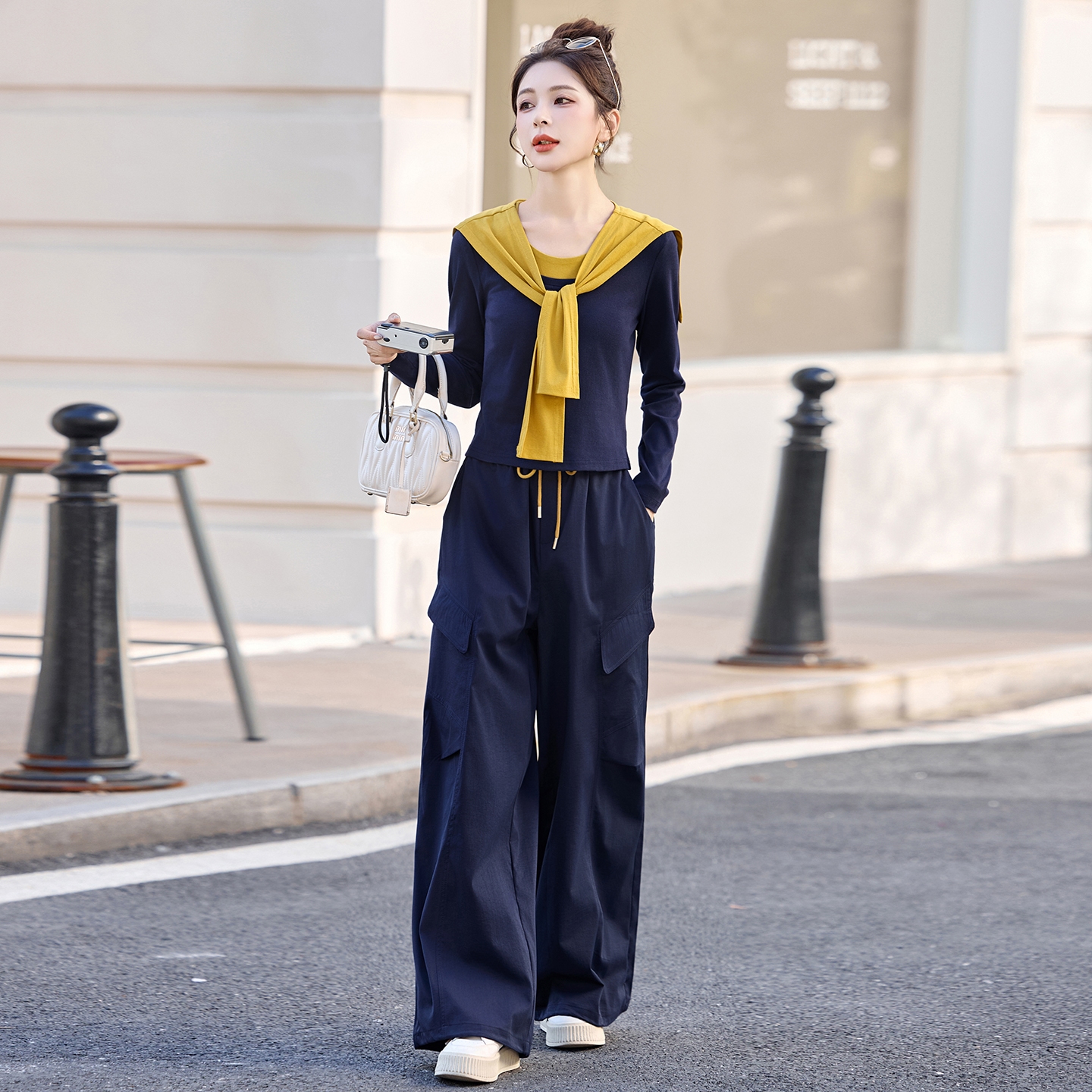 撞色披肩长袖上衣工装阔腿裤两件套女秋季新款休闲套装 服裝批發女裝批發服飾貨源