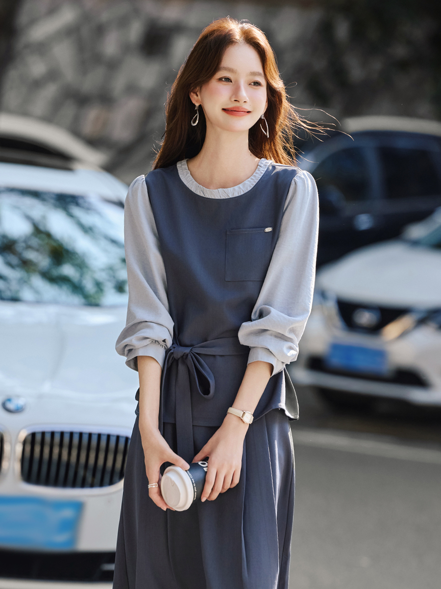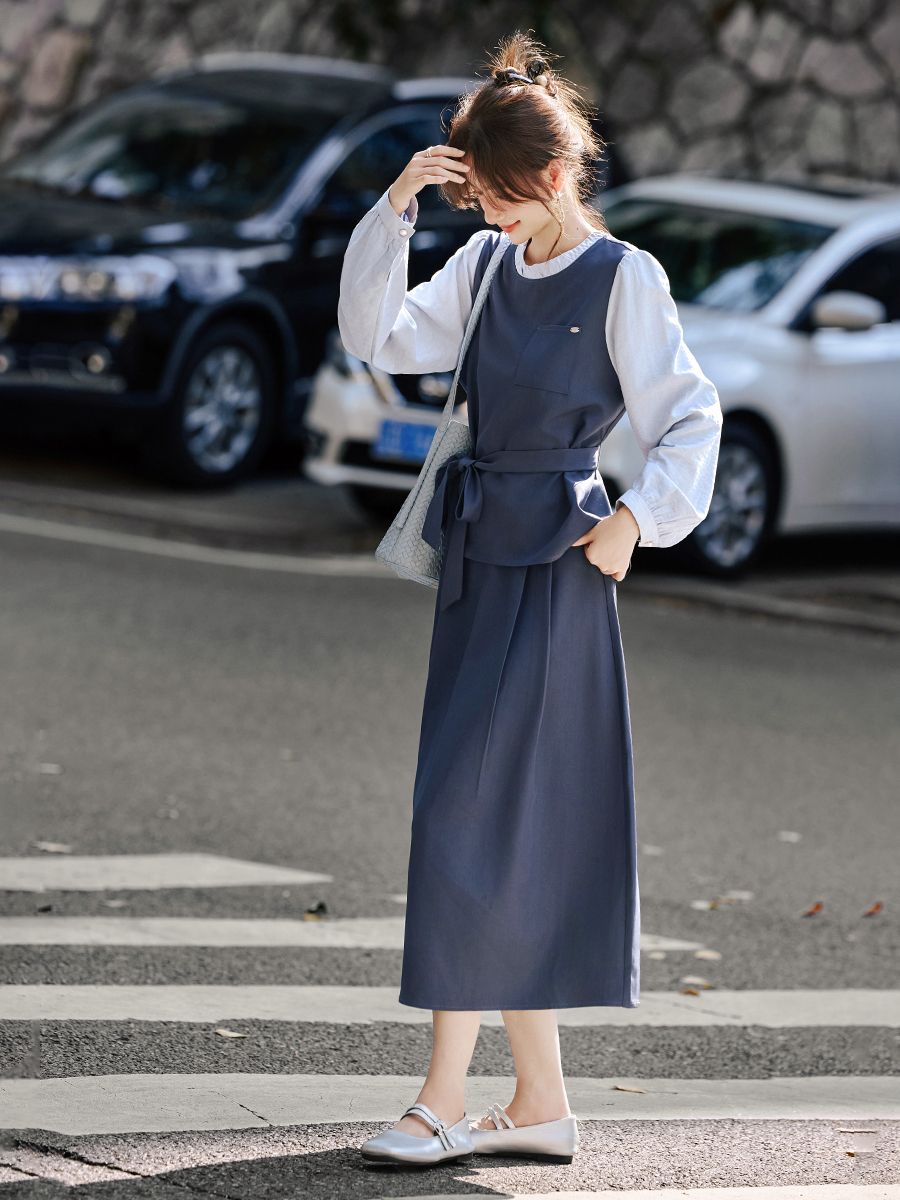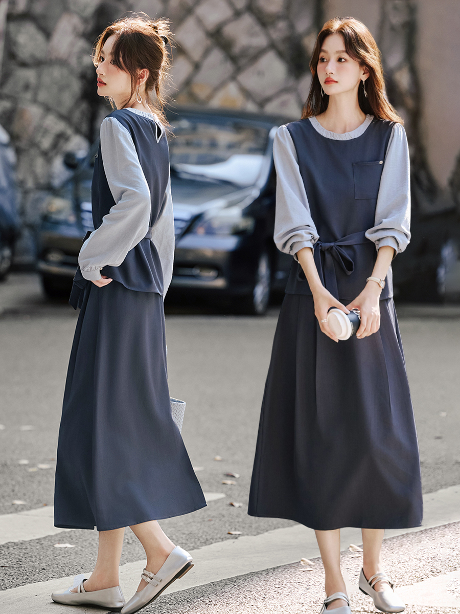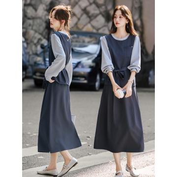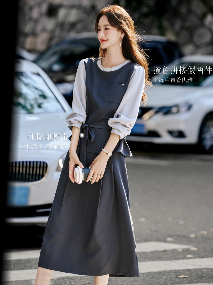 FA44392# 灰色假两件衬衫上衣肌理感长款A字半身裙两件套女秋新款套装 服裝批發女裝批發服飾貨源
