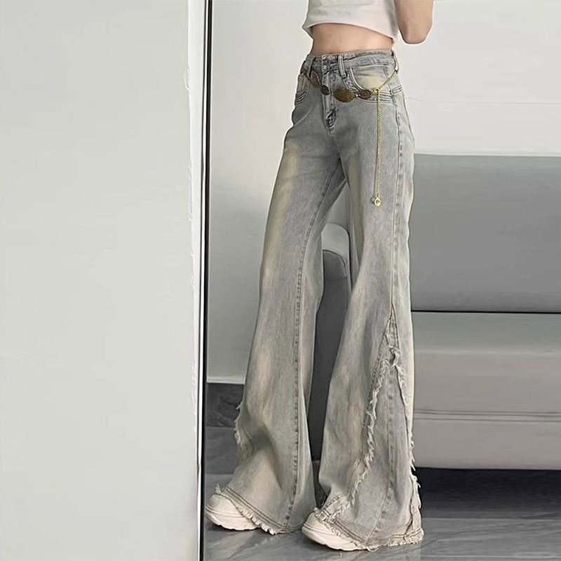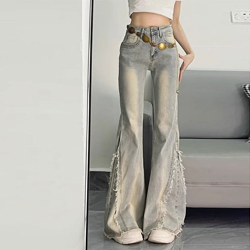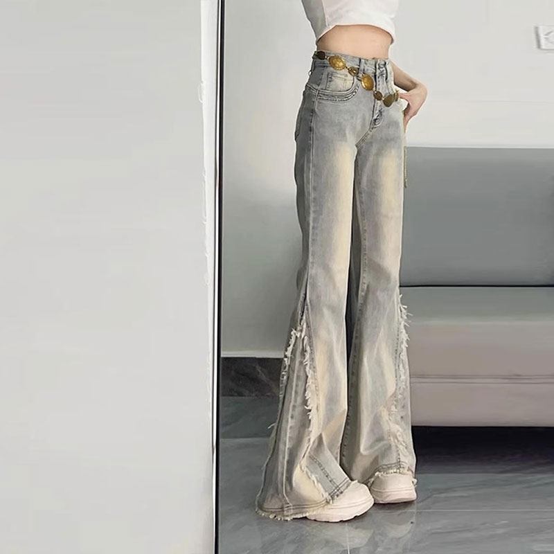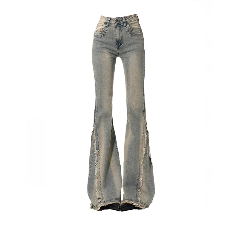 FA44533# 辣妹怀旧蓝高腰微喇叭牛仔裤女毛边拼接设计感修身显瘦直筒马蹄裤 服裝批發女裝批發服飾貨源