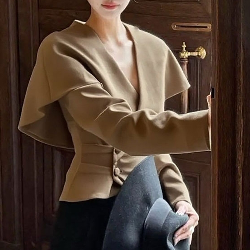 FA44558# 假两件卡其色斗篷衬衫女秋法式高级感减龄洋气高端超好看掐腰上衣 服裝批發女裝批發服飾貨源