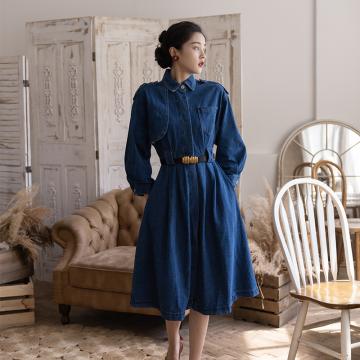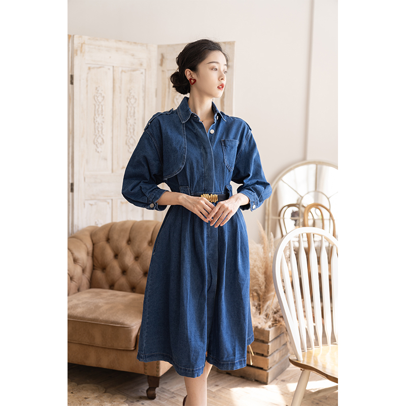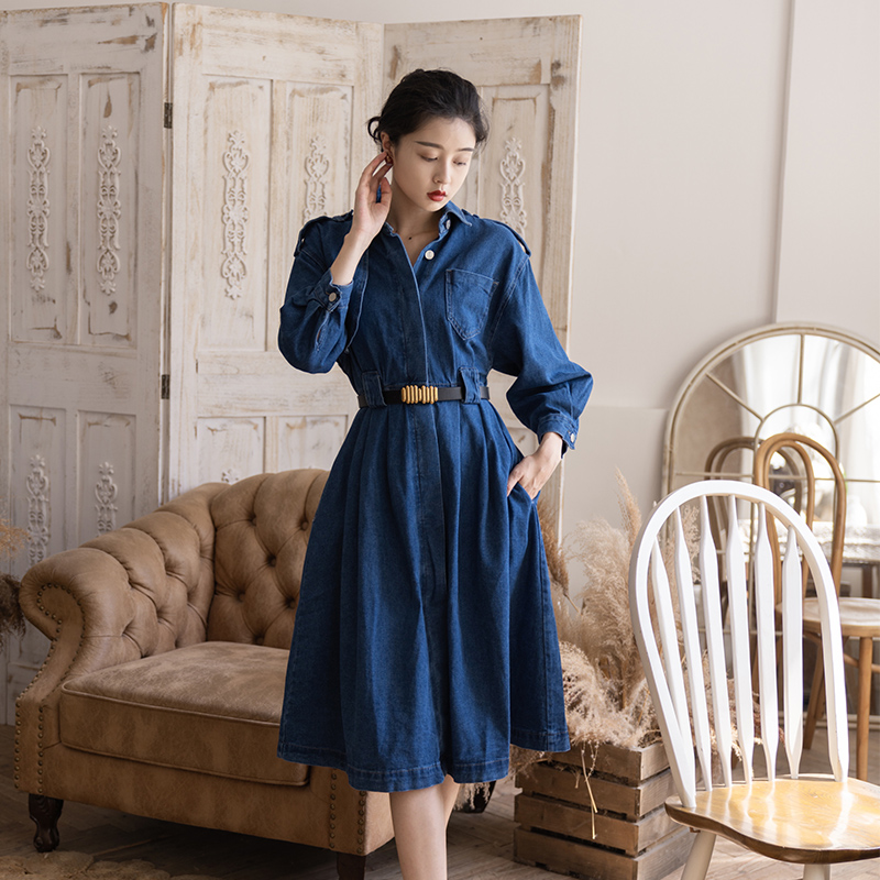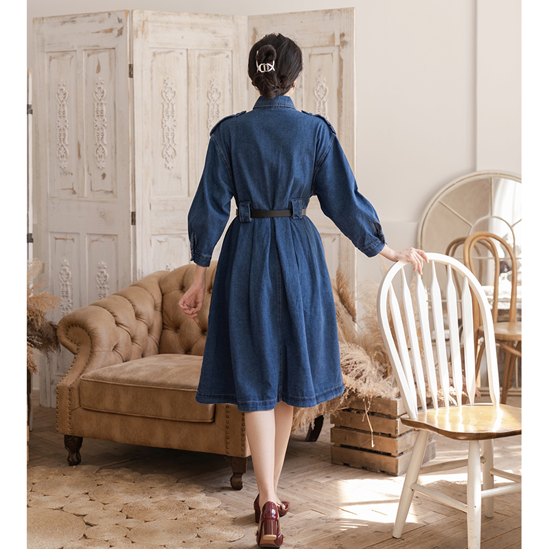 FA44599# 复古牛仔连衣裙女秋冬新款中长款风衣式显瘦长袖裙子送腰带 服裝批發女裝批發服飾貨源