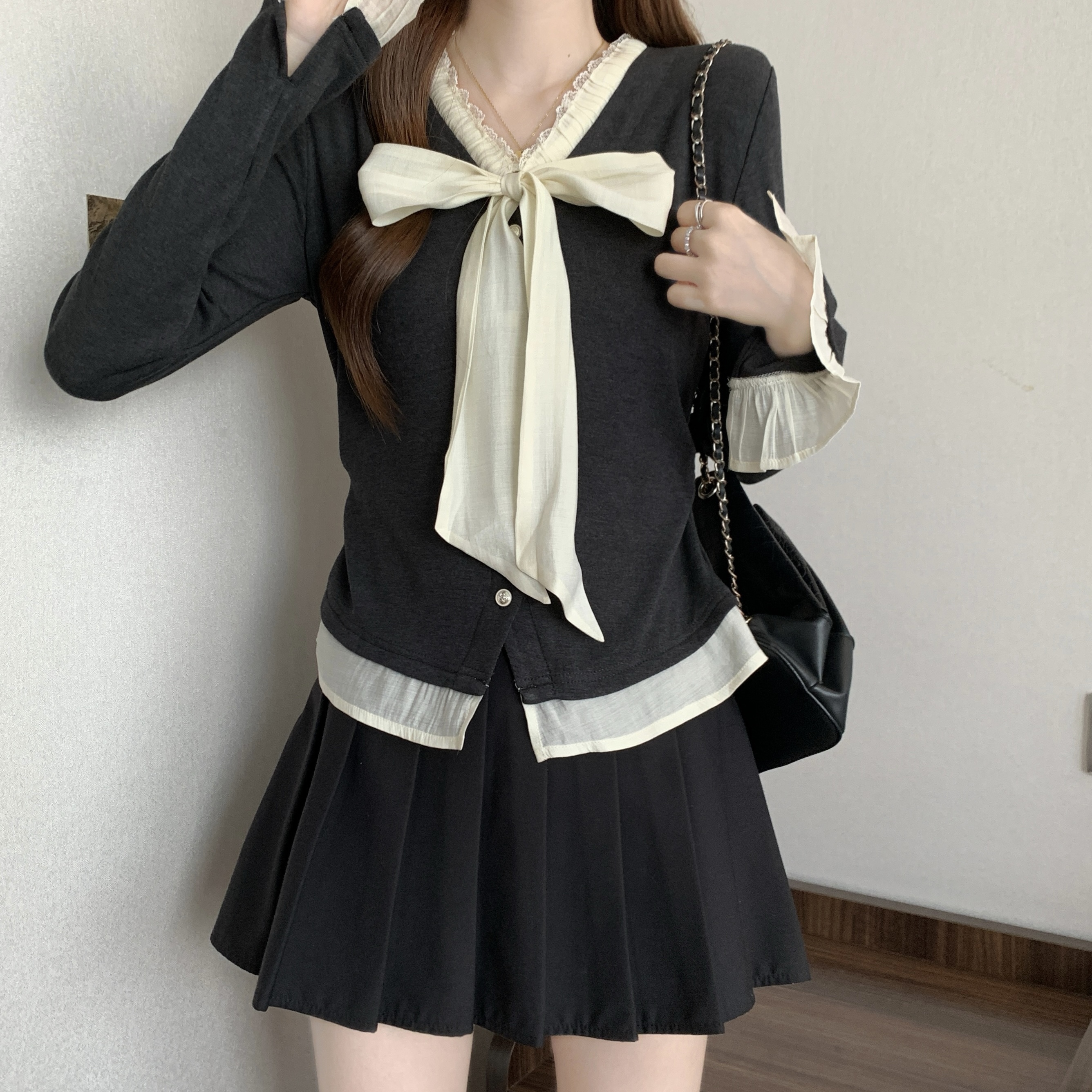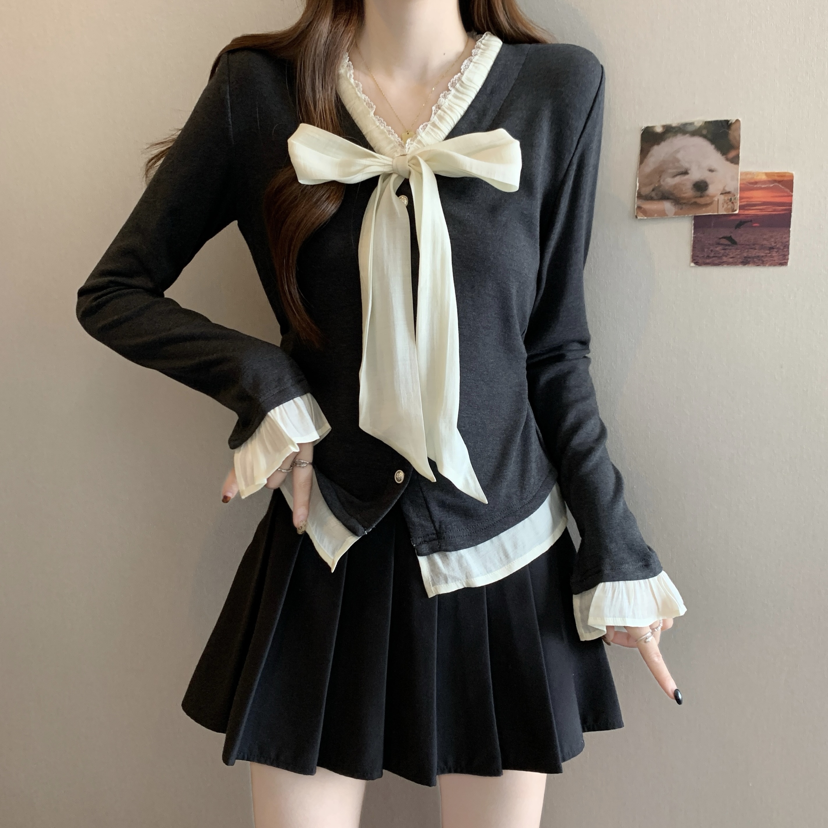 FA44609# 大码女装秋季新款设计感上衣蕾丝长袖衬衫女显瘦遮肉针织衫 服裝批發女裝批發服飾貨源