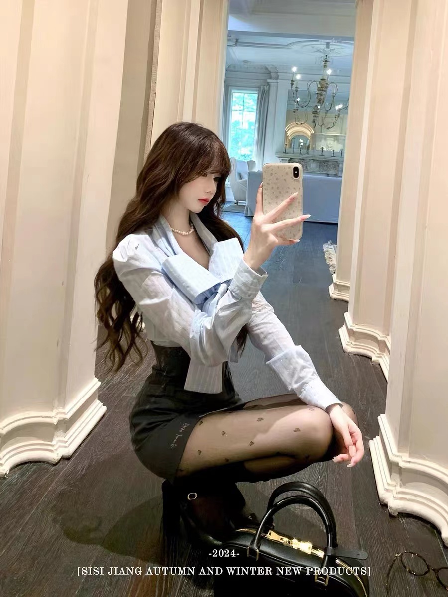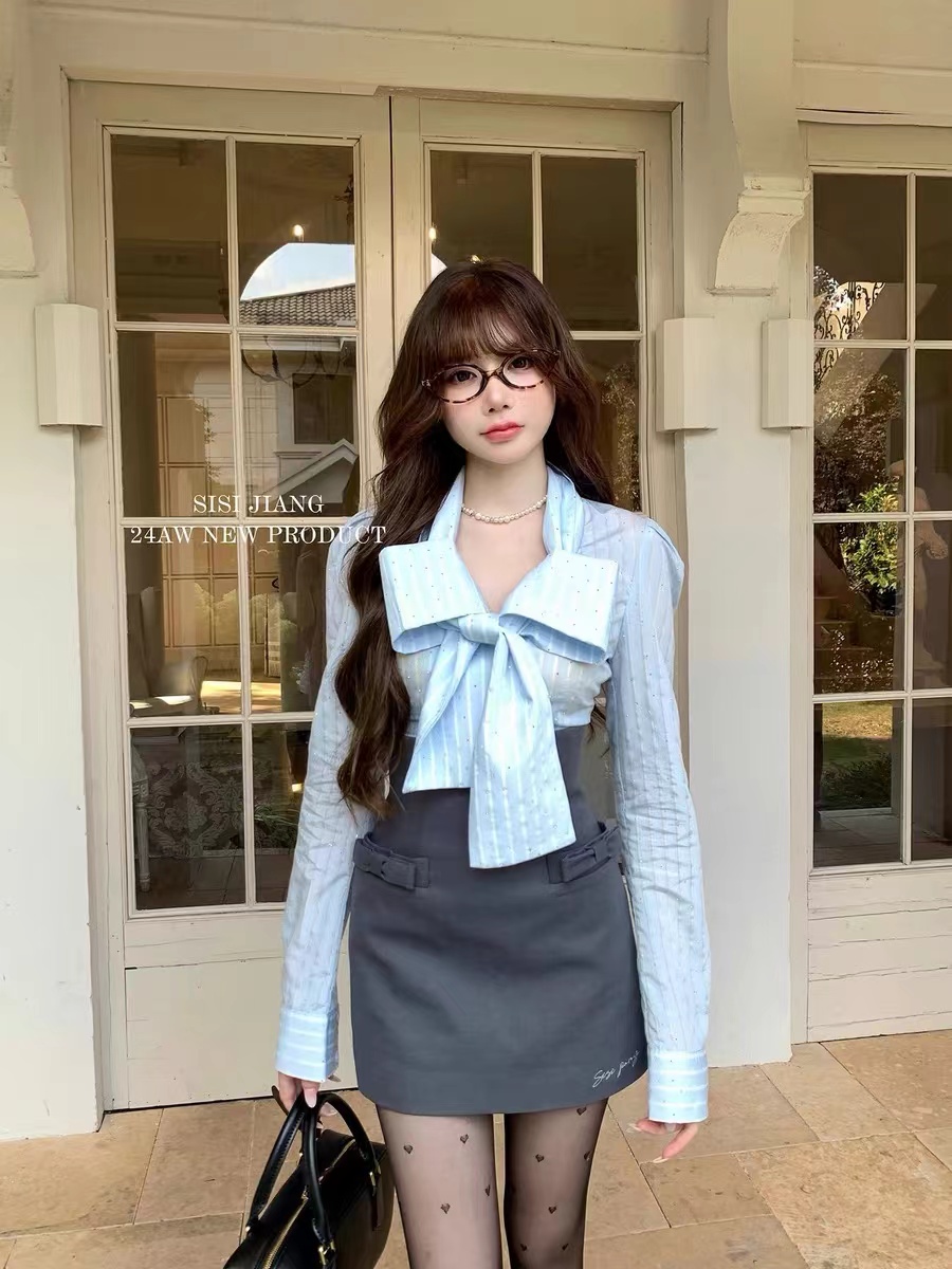 FA44674# 早秋甜御蝴蝶结闪钻设计甜美长袖衬衫两件套 服裝批發女裝批發服飾貨源