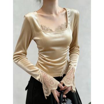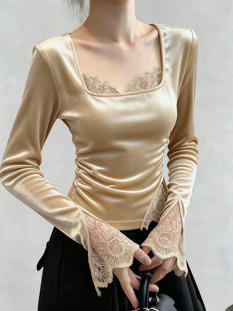 FA44691# 巨好看的早秋衬衫女高级感轻奢减龄洋气独特漂亮掐腰杏色丝绒上衣 服裝批發女裝批發服飾貨源