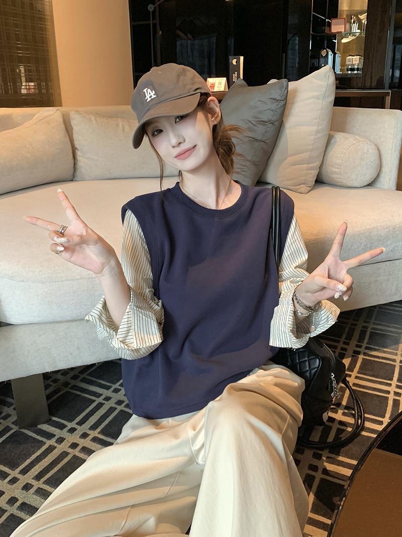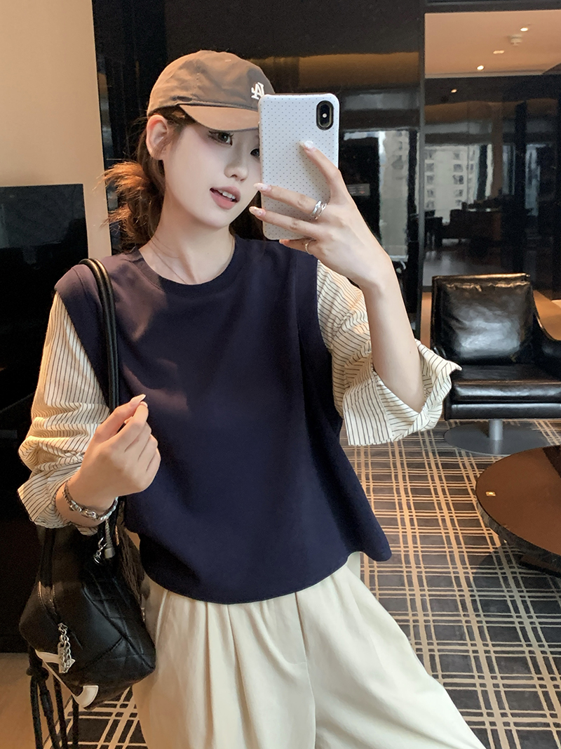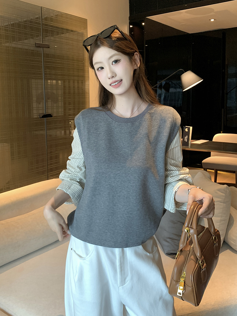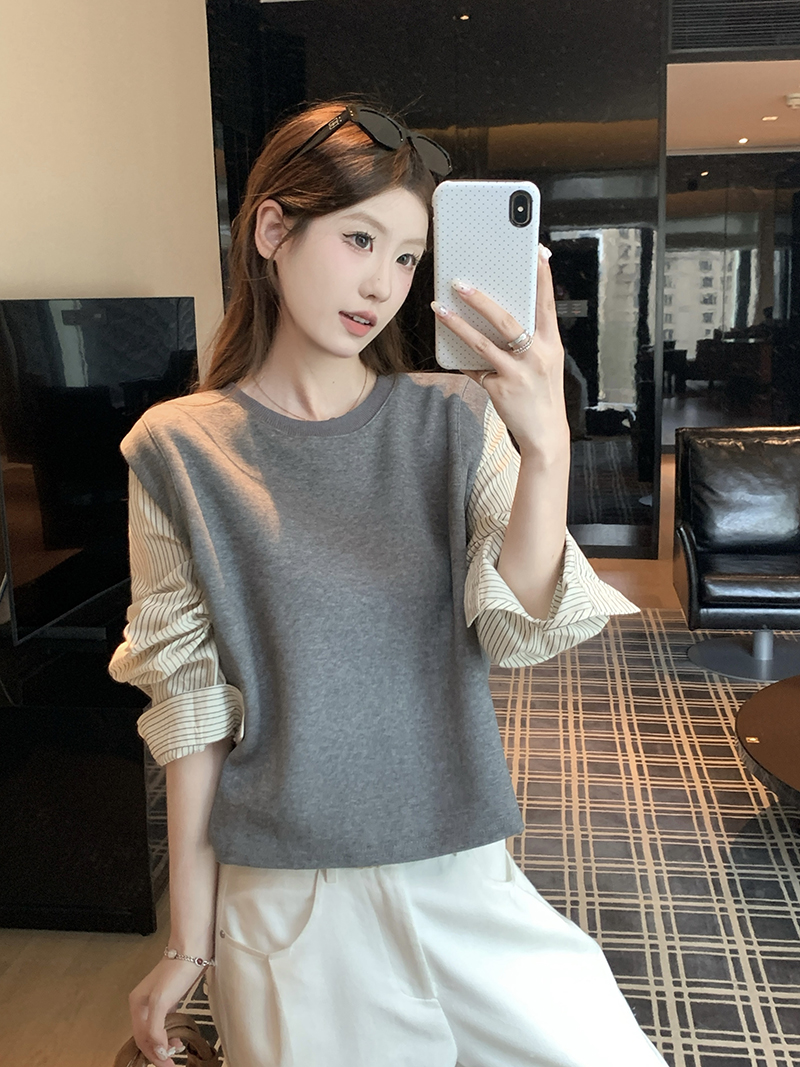 FA44727# 秋季新宽松韩系条纹假两件衬衫女 服裝批發女裝批發服飾貨源
