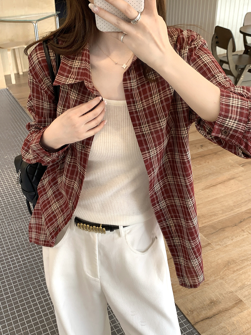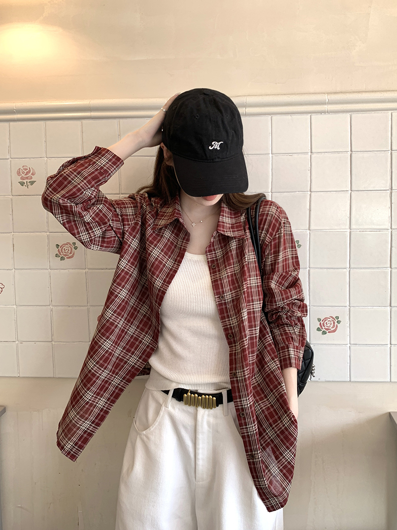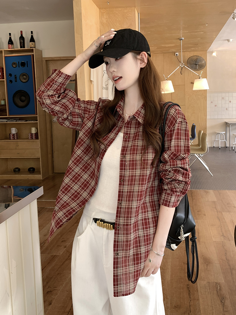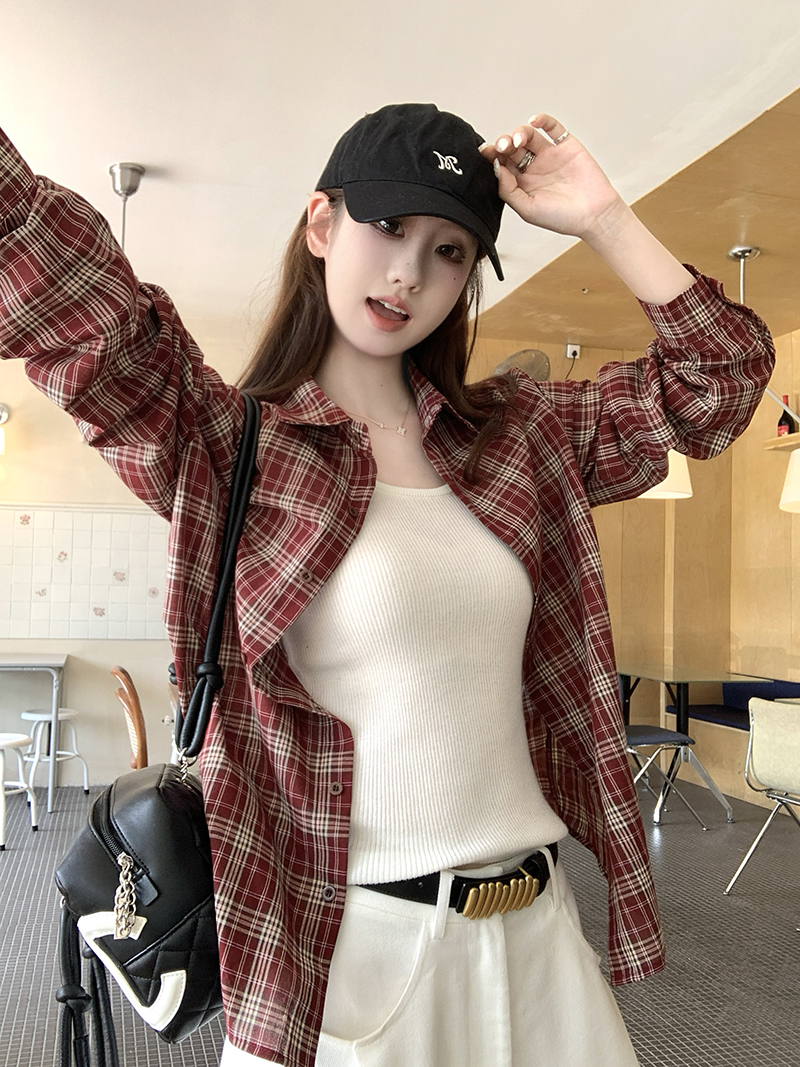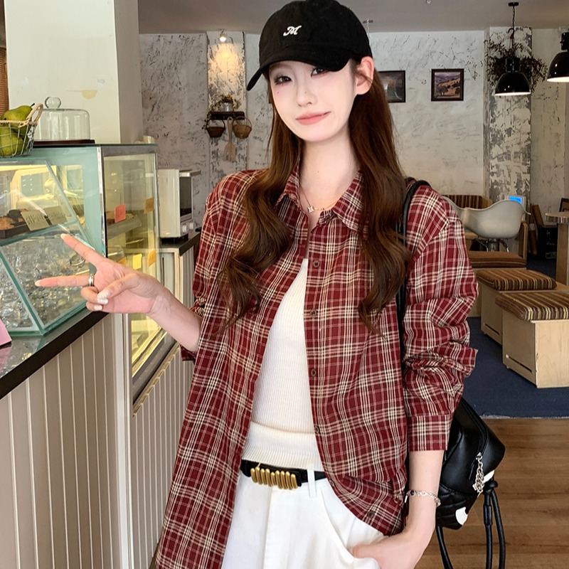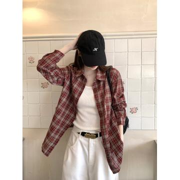 FA44734# 秋季新款韩系复古红色格子衬衫女 服裝批發女裝批發服飾貨源