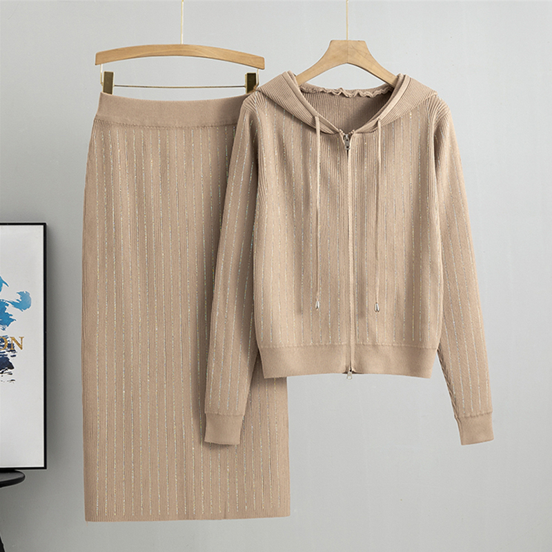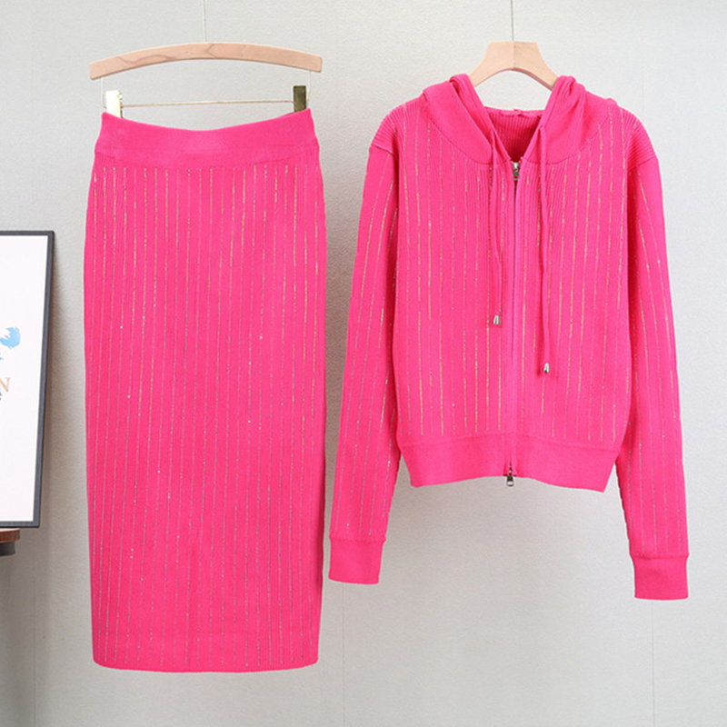 FA44891# 休闲重工满件烫钻套装名媛新款连帽春秋开衫套装两件套裙女 服裝批發女裝批發服飾貨源