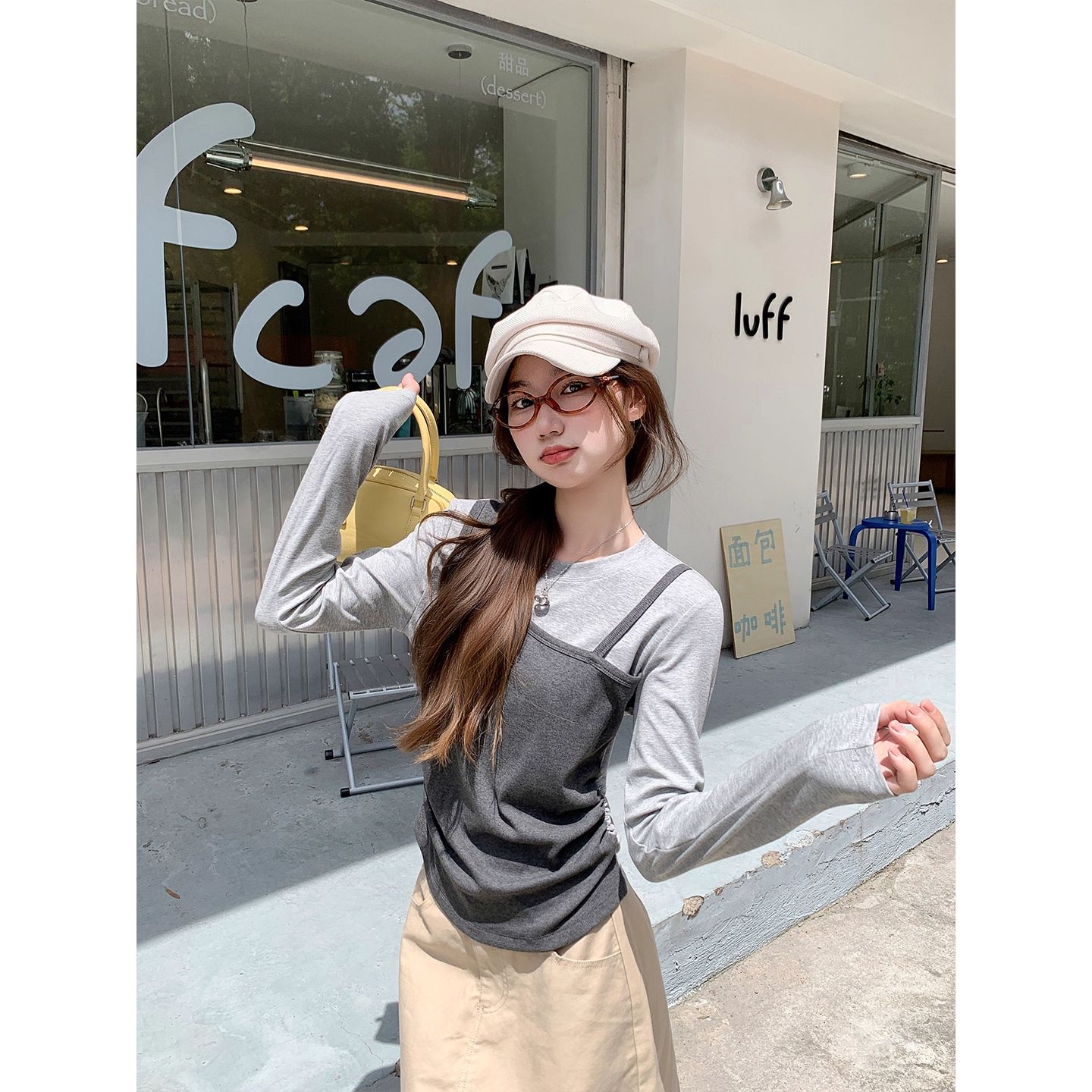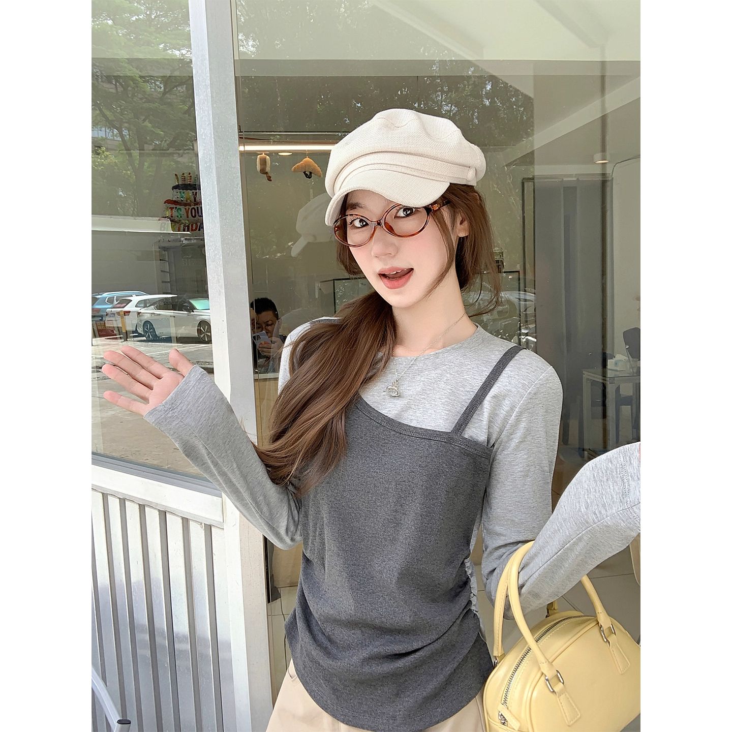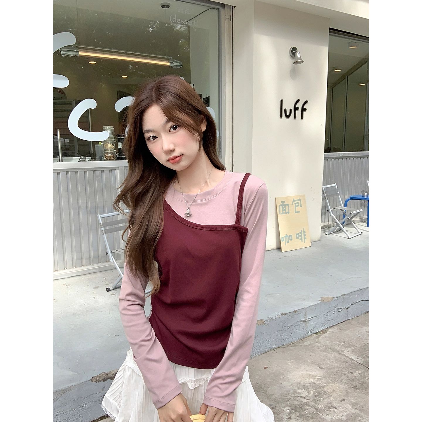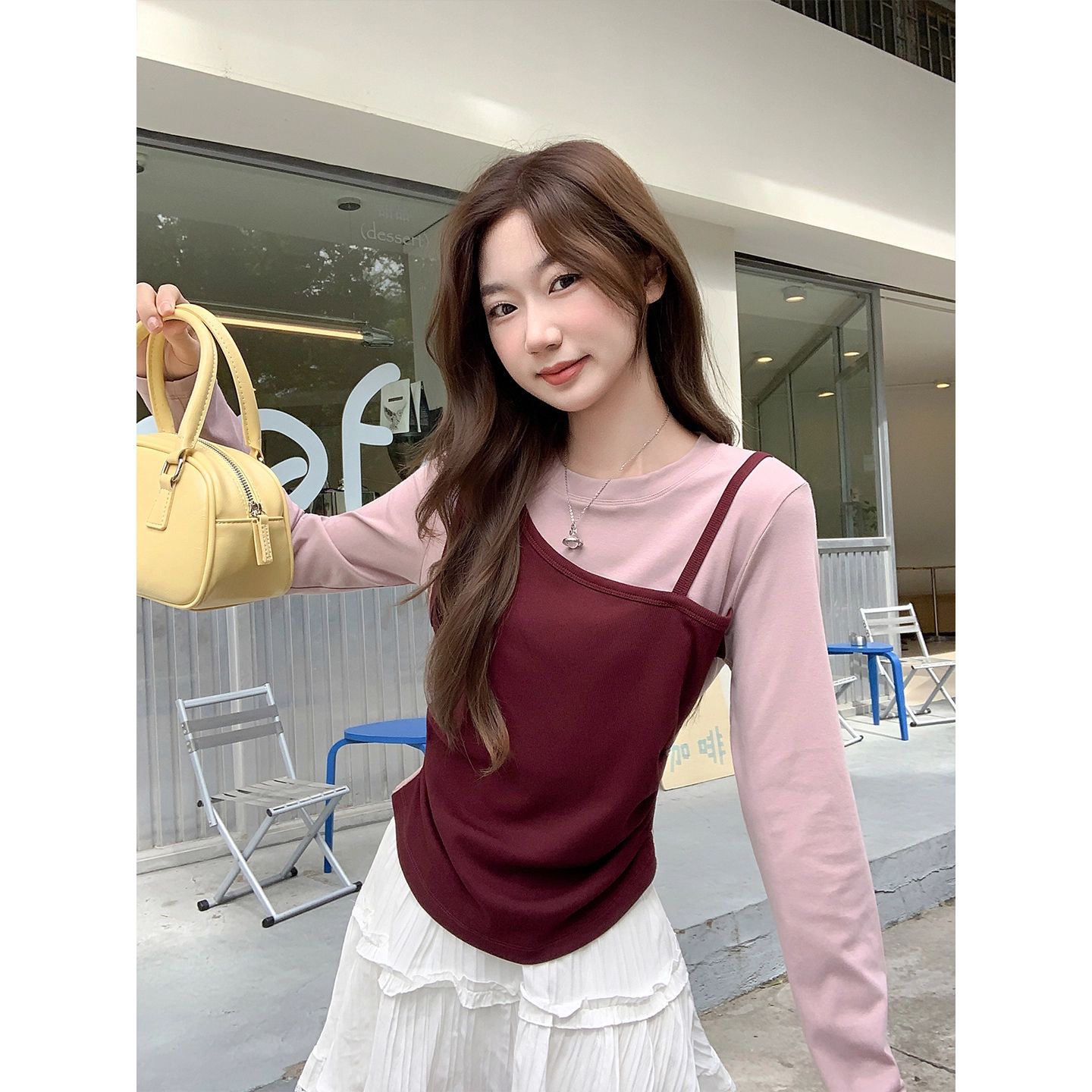 FA45036# 原版做工粉色吊带假两件长袖女秋新纯欲显瘦设计感温柔上衣 服裝批發女裝批發服飾貨源