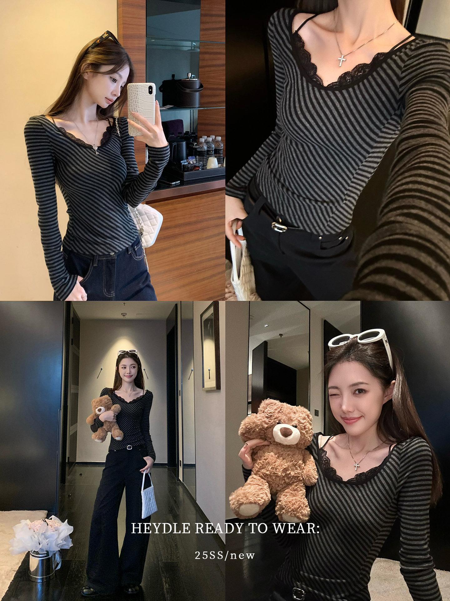 FA45039# 蕾丝拼接设计假两件T恤条纹修身显瘦打底上衣 服裝批發女裝批發服飾貨源