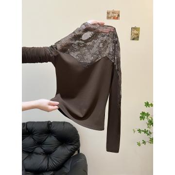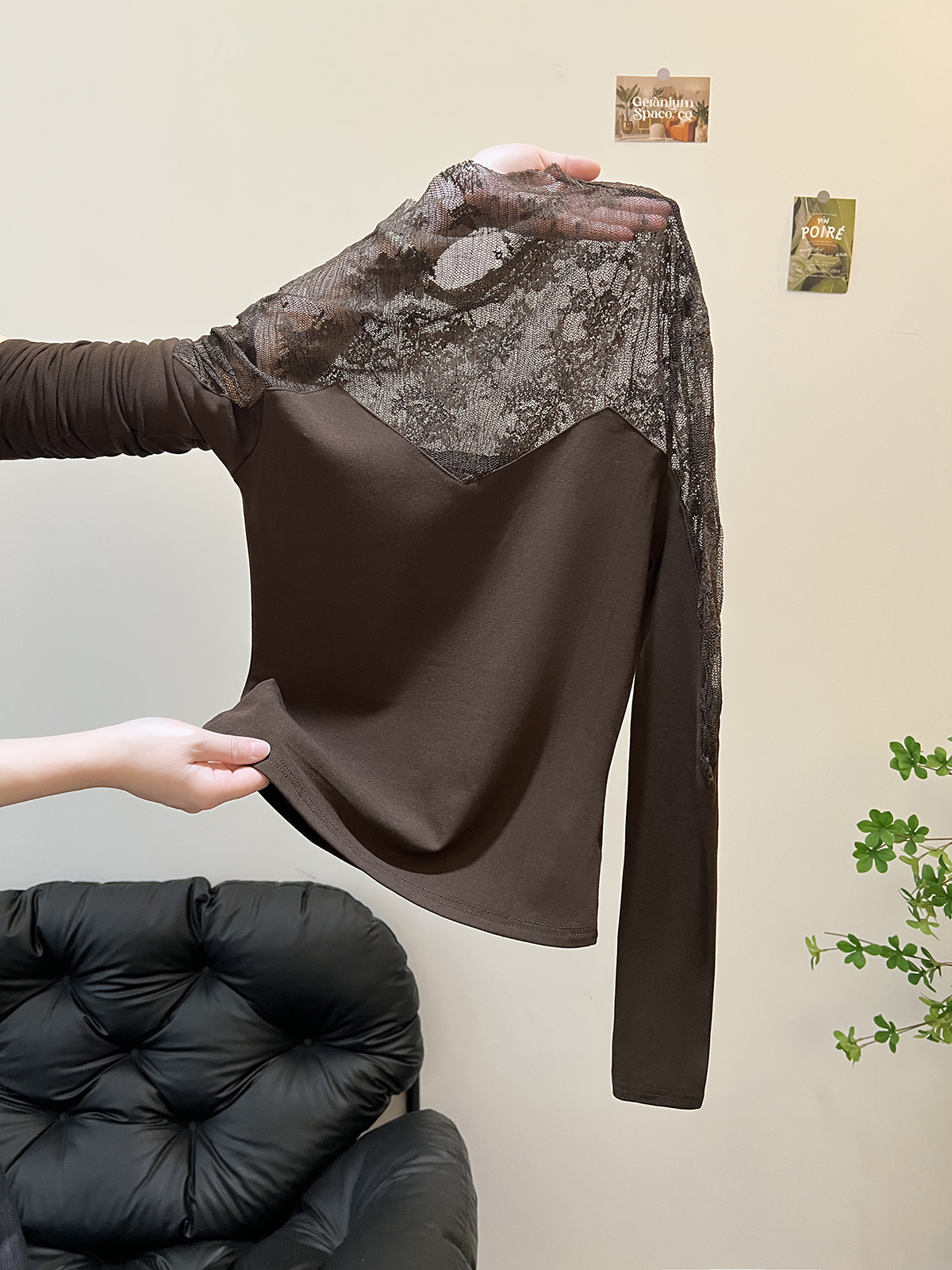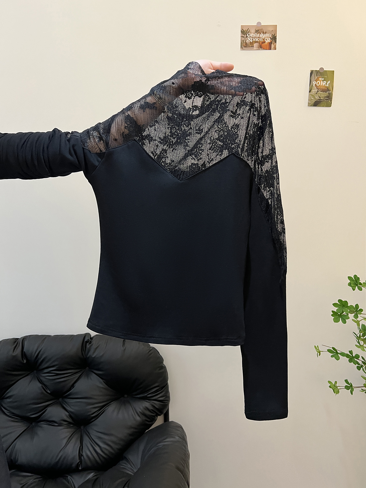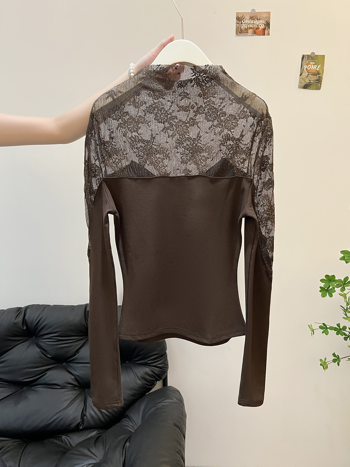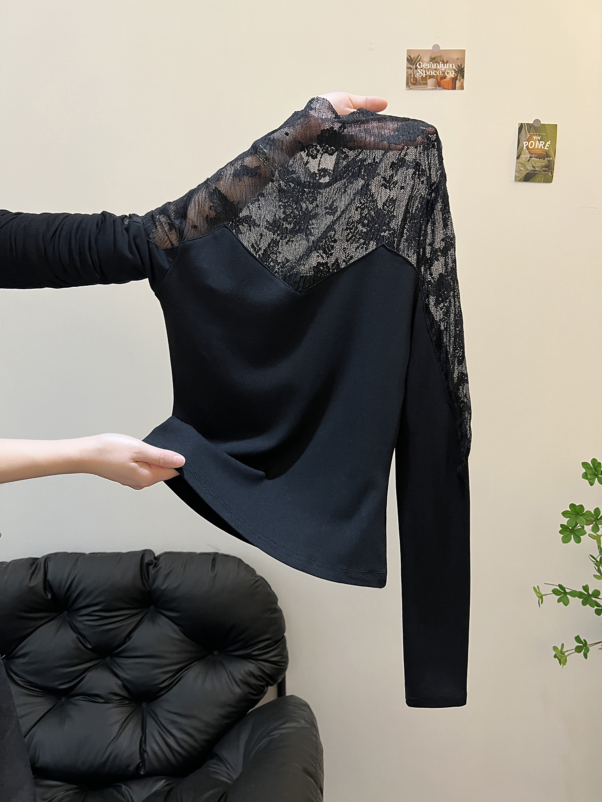 FA45082# 半高领蕾丝加绒打底衫女内搭秋冬法式掐腰紧身镂空叠穿网纱上衣 服裝批發女裝批發服飾貨源