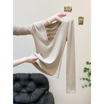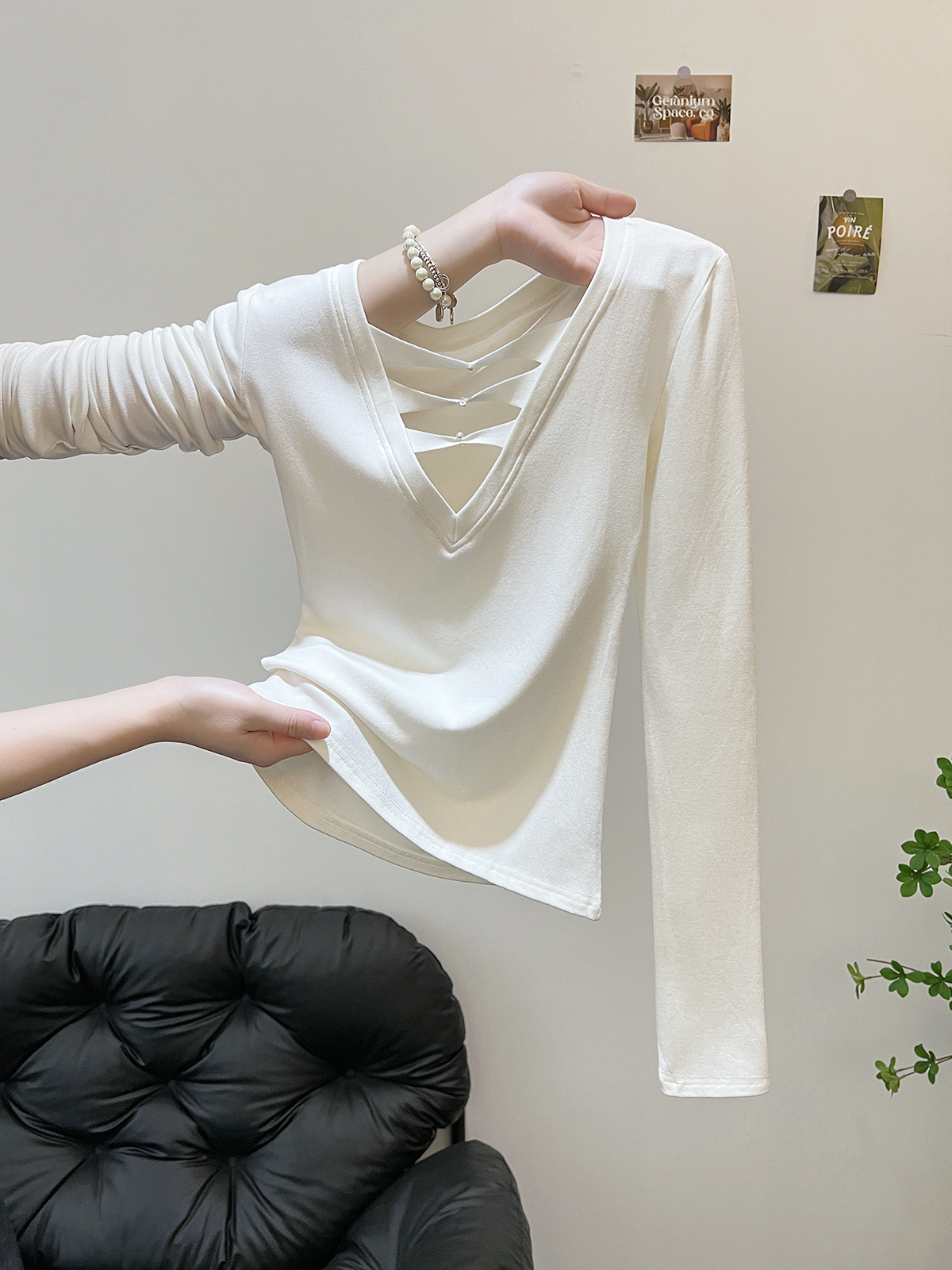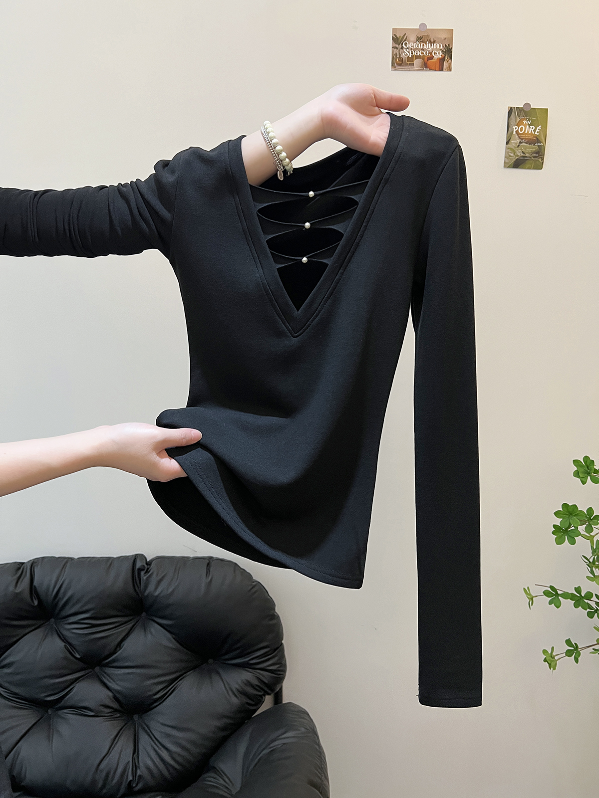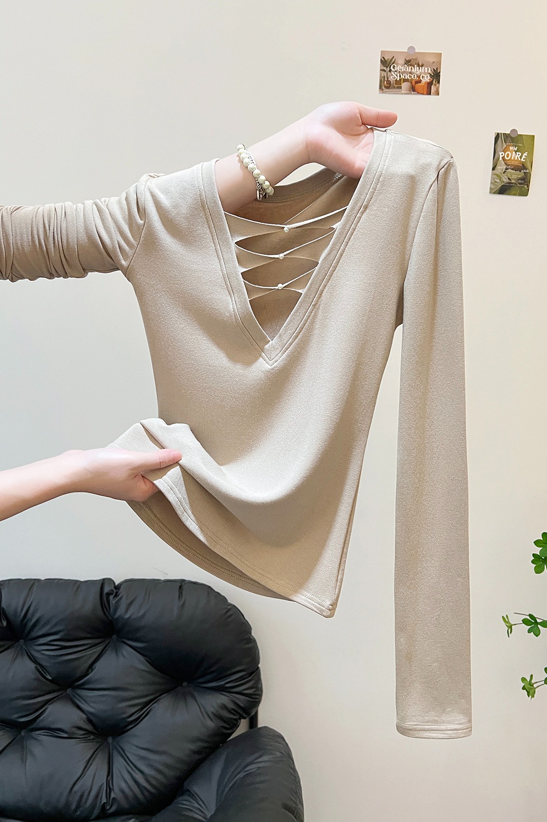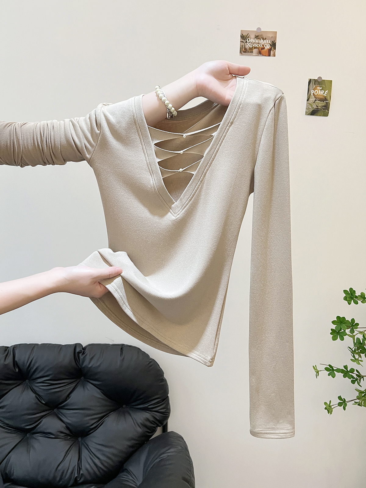 FA45086# 纯欲辣妹性感低胸v领上衣女秋冬显身材长袖t恤磨毛打底衫内搭 服裝批發女裝批發服飾貨源